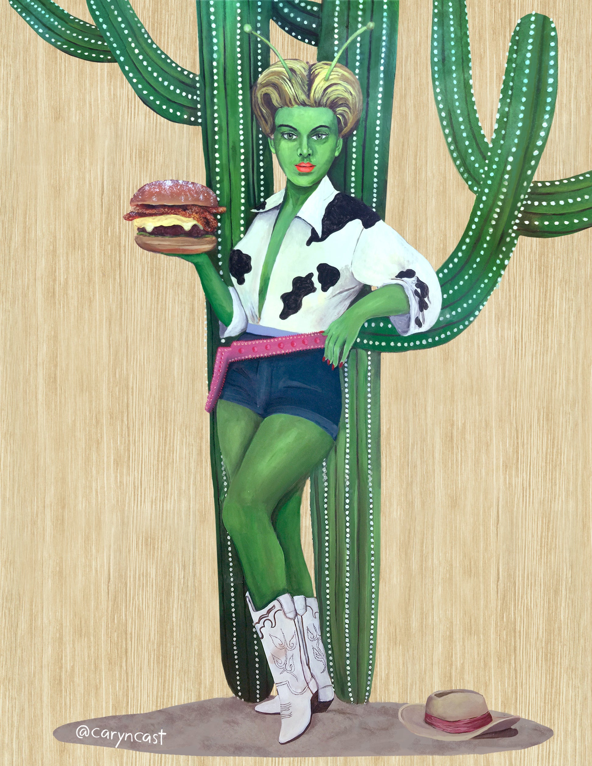 The Alien Hamburger Queen cooks up the best burgers in town. She is printed on Epson acid-free luster paper. This photographic paper has a luster matte finish, is archival and will not fade one bit !