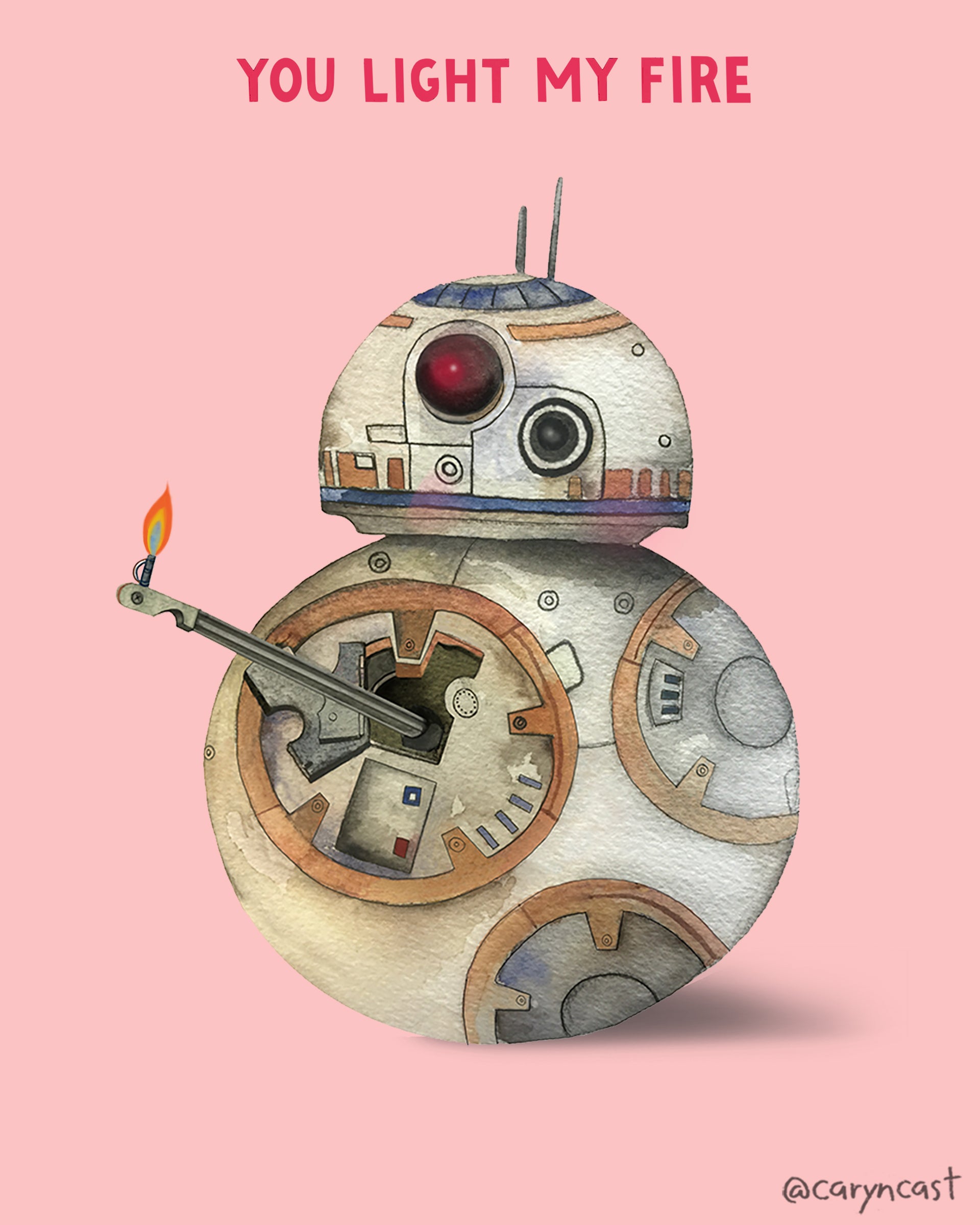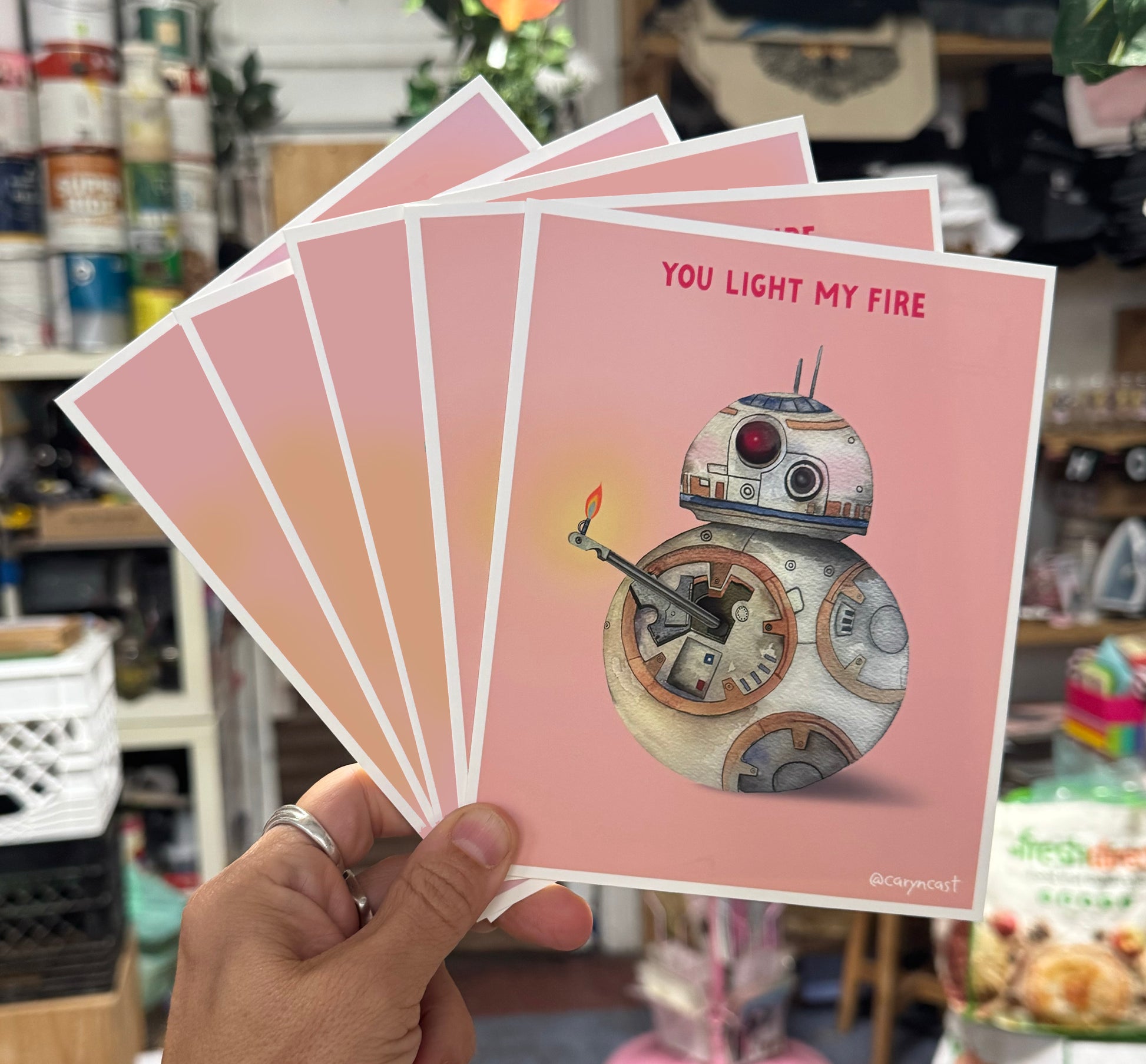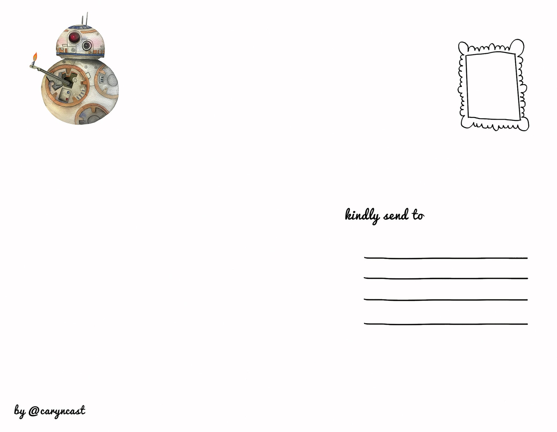 Give the romantic gift of a BB8 postcard to your favorite Star Wars friend, lover, or main squeezy. This is a drawing of the infamous BB8. Double sided postcard comes with a clever description on the back.