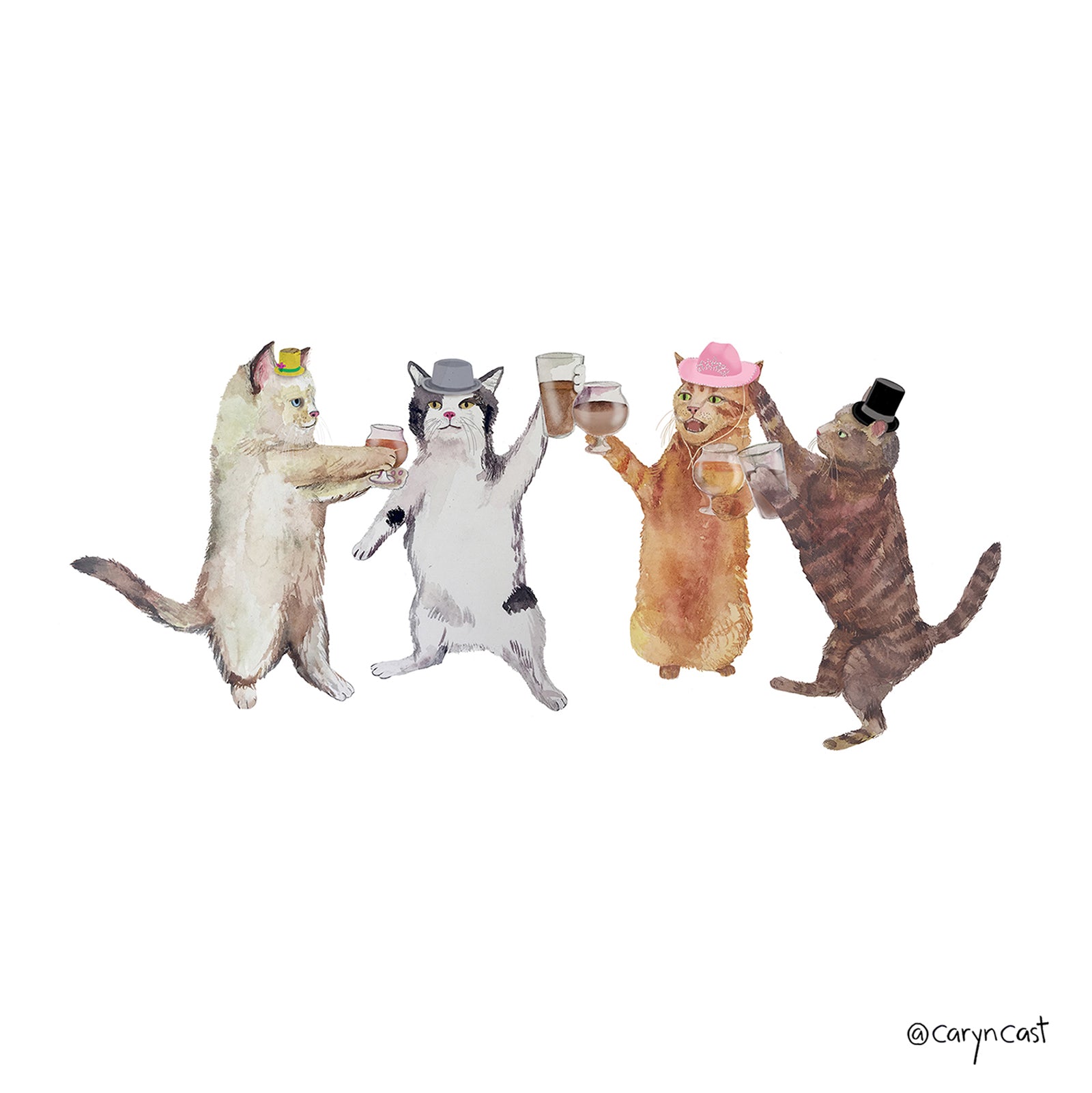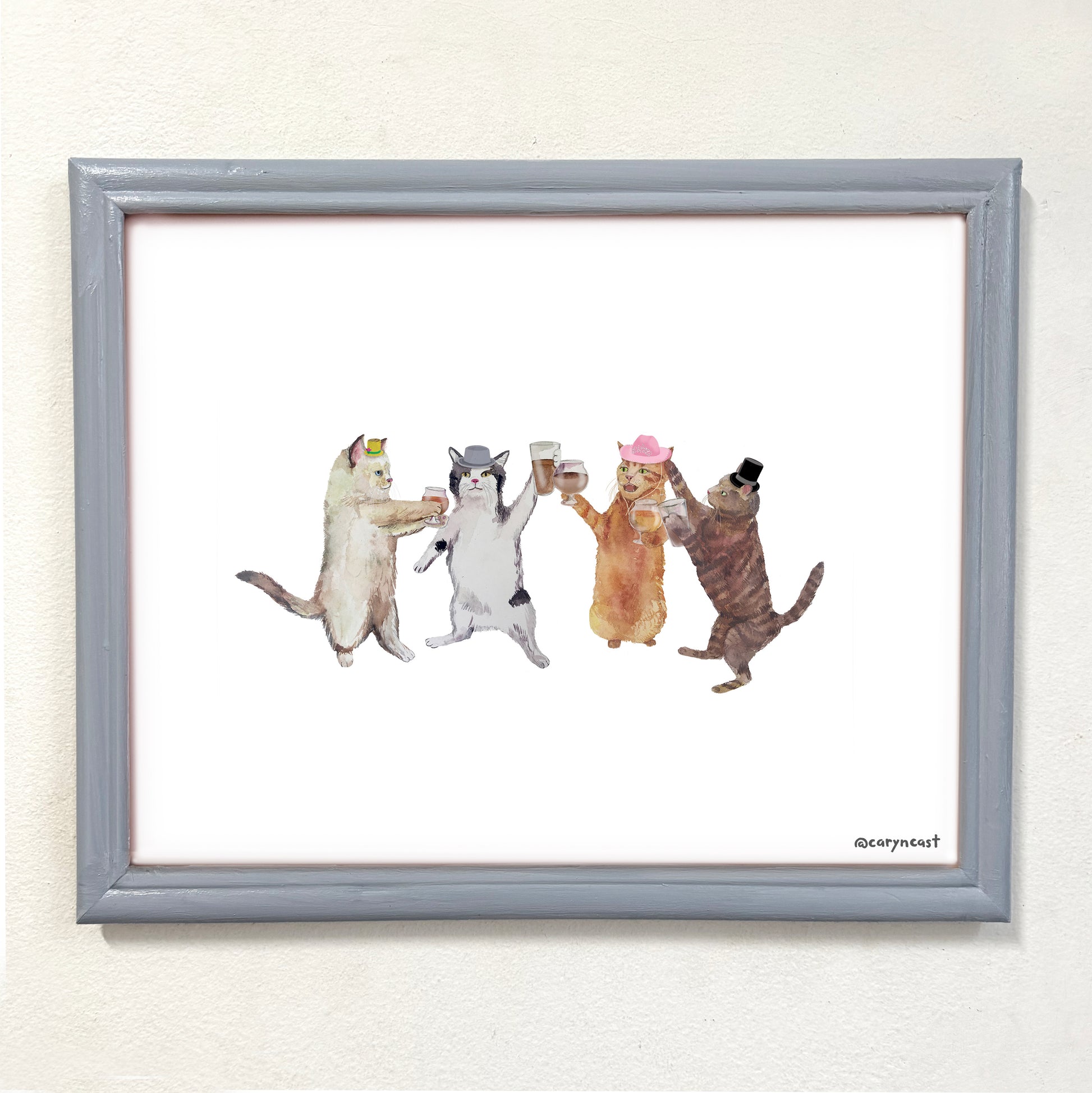 Here are cats doing what they do best...cheers to beers! This is a print created from an original watercolor illustration for a craft beer bar in Queens, NYC. The print is created on archival Epson hot press acid-free paper, and will not fade one bit.