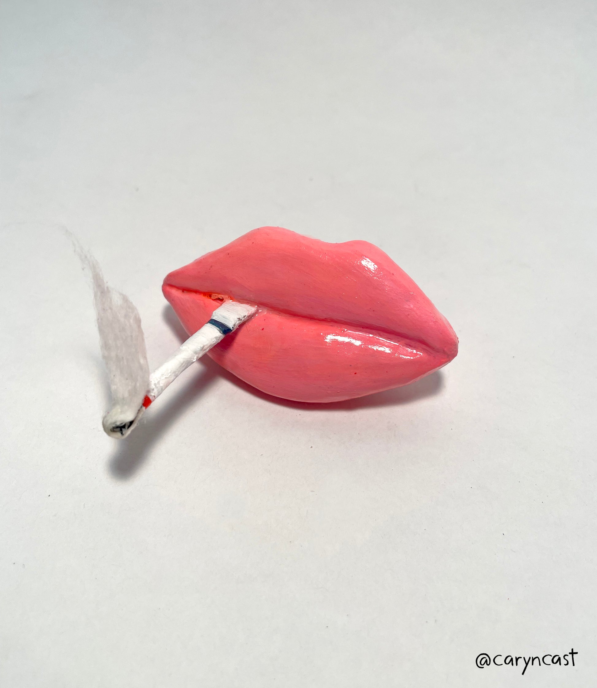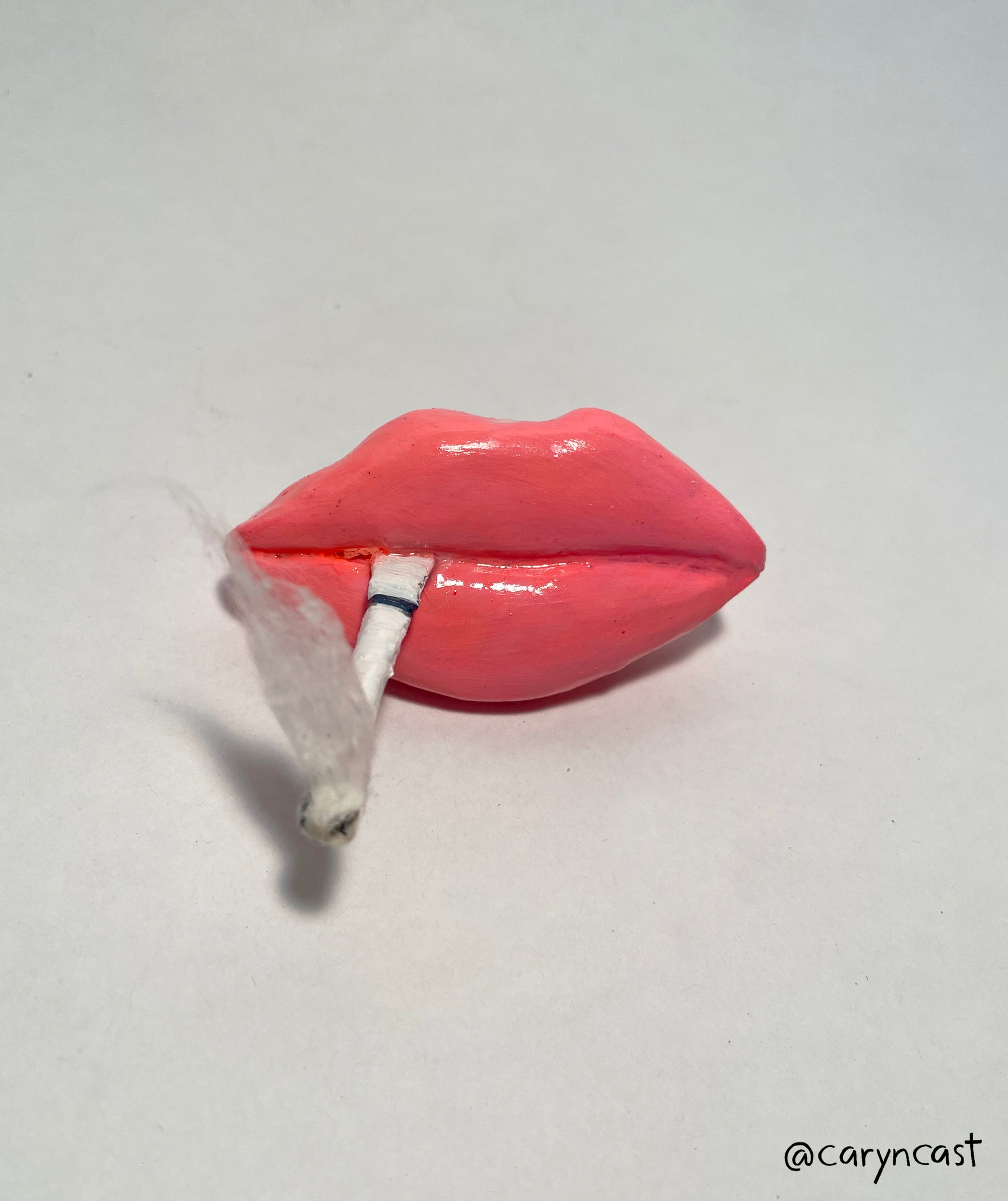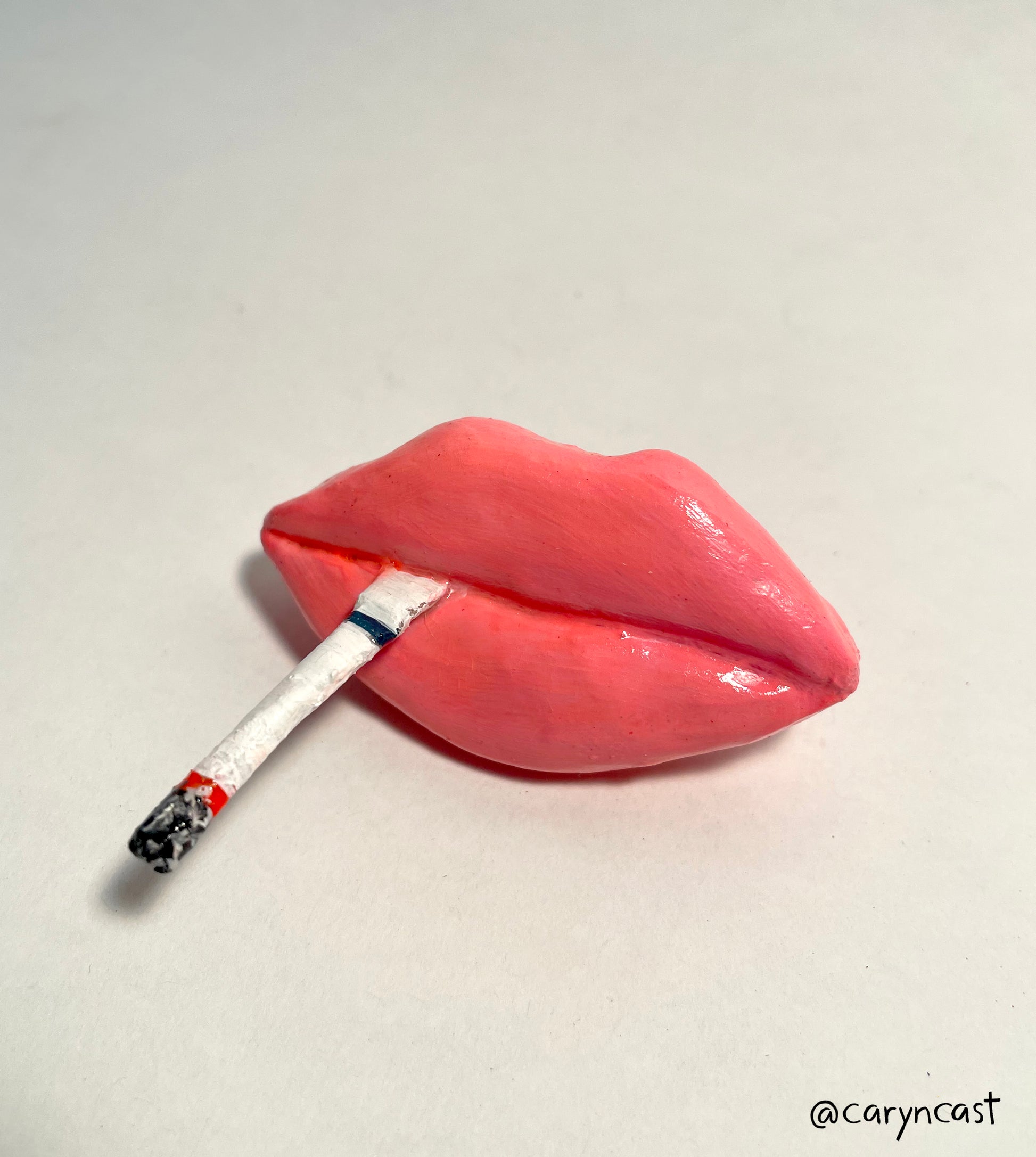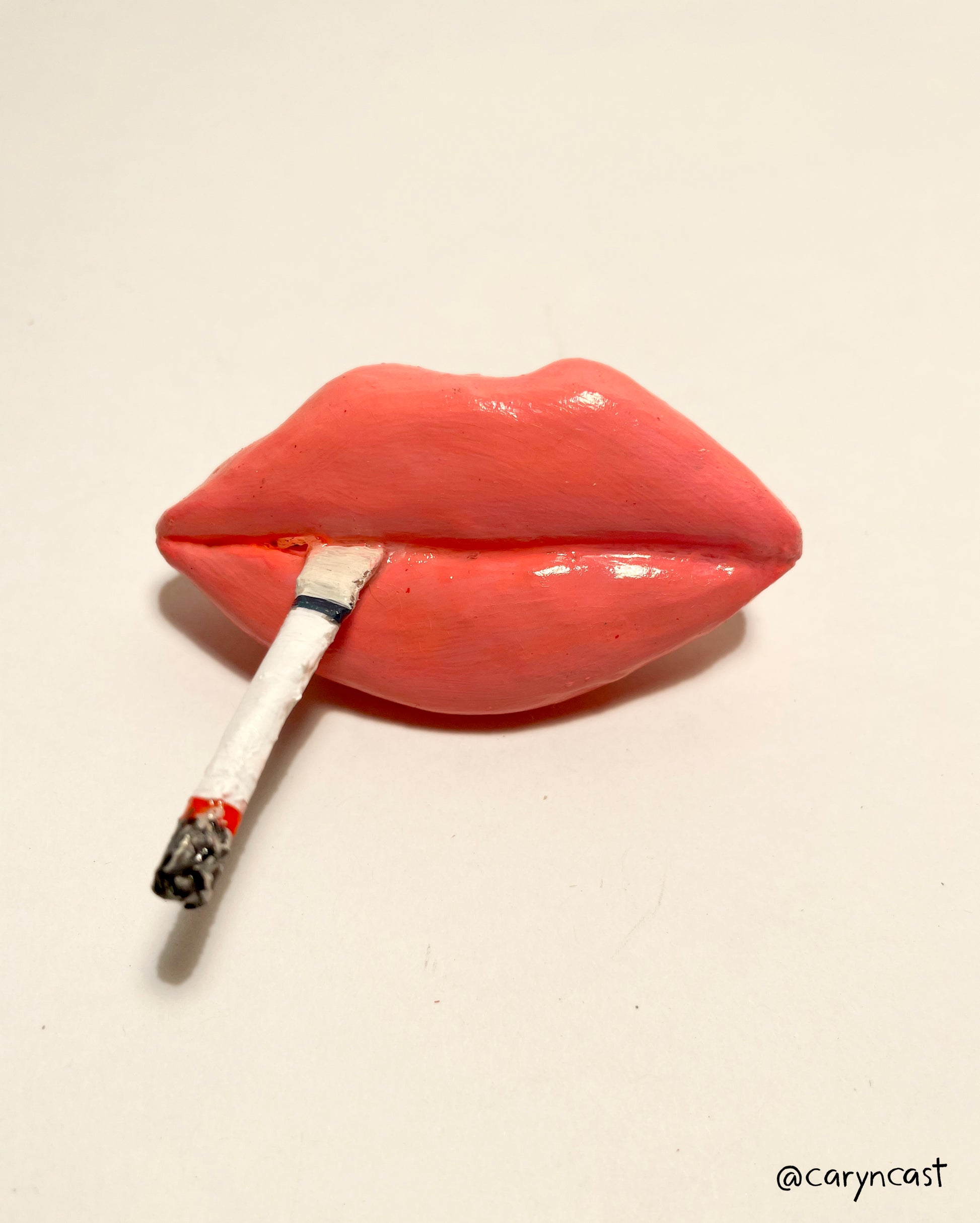 Claude is smoking a misty and exuding all kinds of romance. This clay mouth sculpture coated in shiny resin measures 2" wide and 1.5" tall. Attached on the back is a very strong magnet, perfect for your refrigerator, metal filing cabinet, locker, or any metal thing that needs some support
