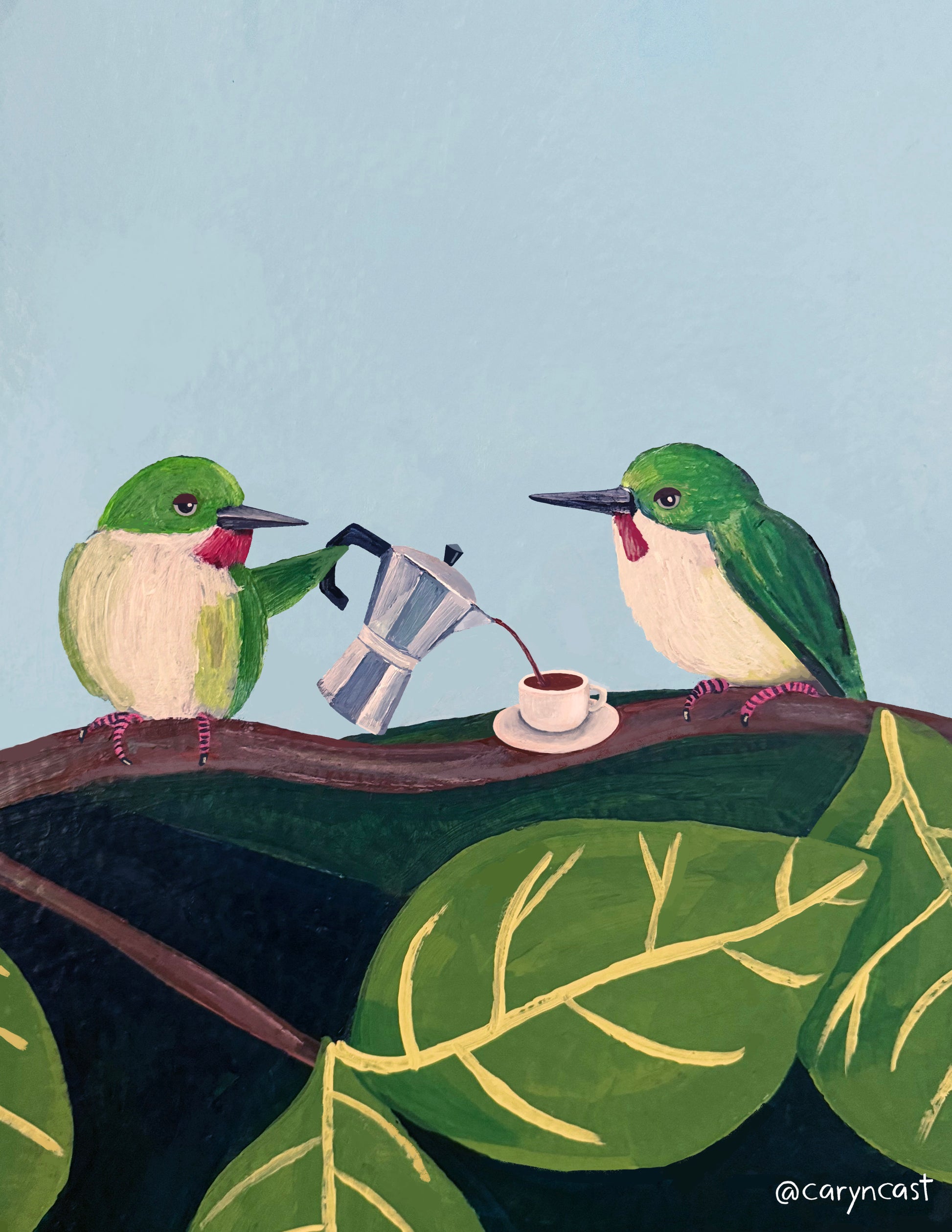 Two Puerto Rican Tody birds having a café . This little pair is part of a larger landscape mural painted in Puerto Rico featuring native flowers, plants and animals. Cafecito Time is now available as a greeting card. Printed on Epson archival acid free hot press paper, this inside is left blank for your thoughts. Card measures 5" X 7" and comes paired with a recycled paper charcoal colored envelope.