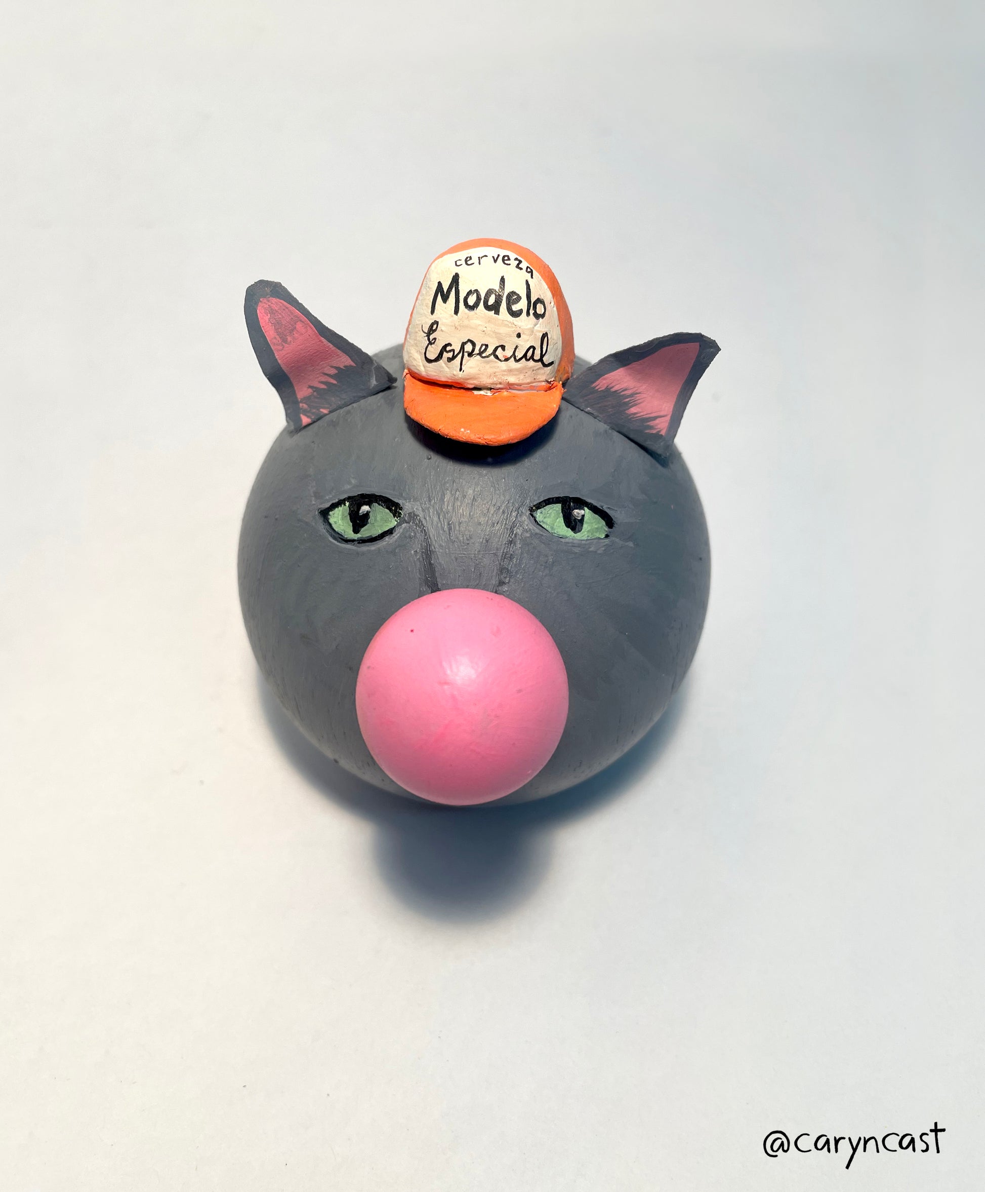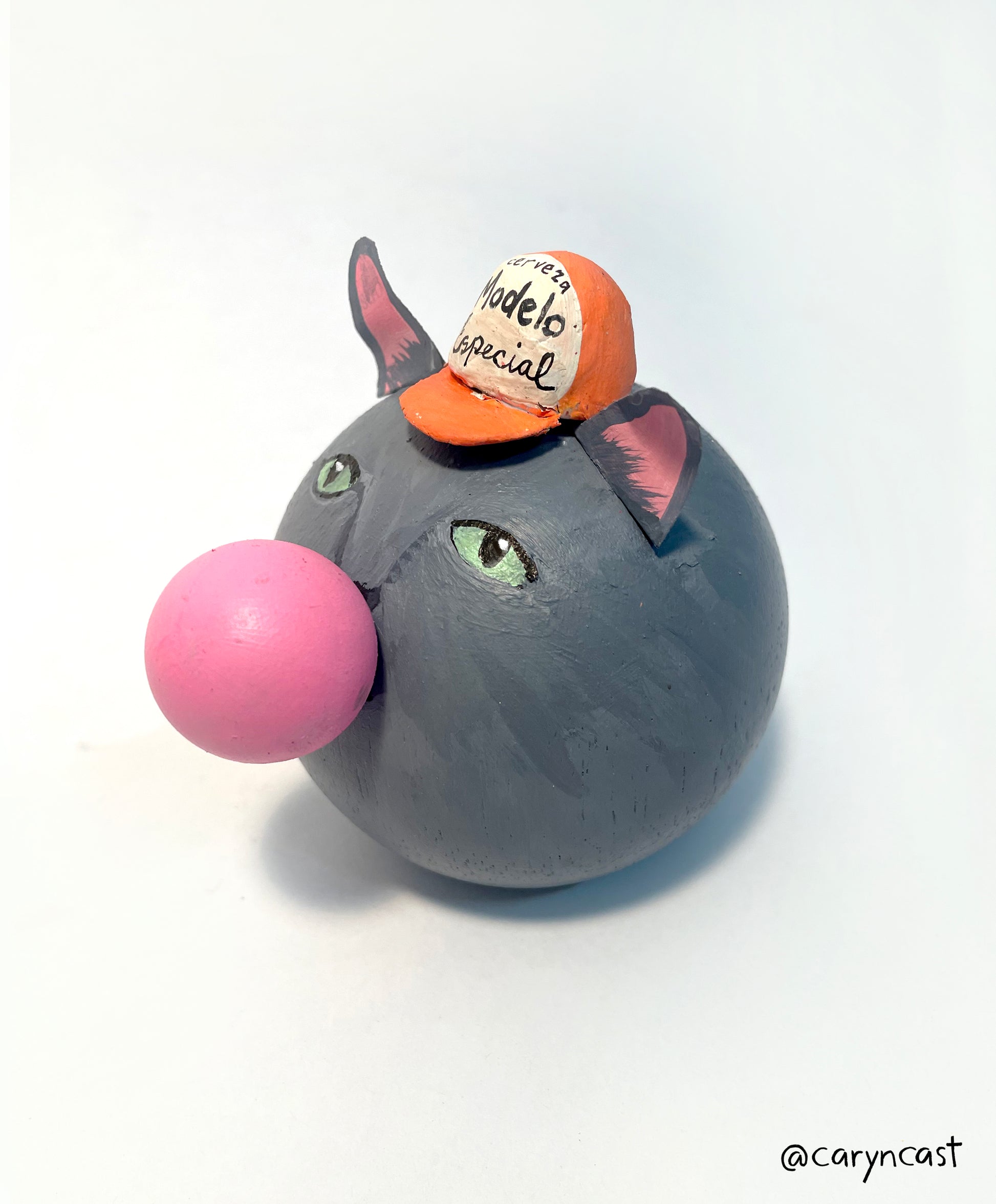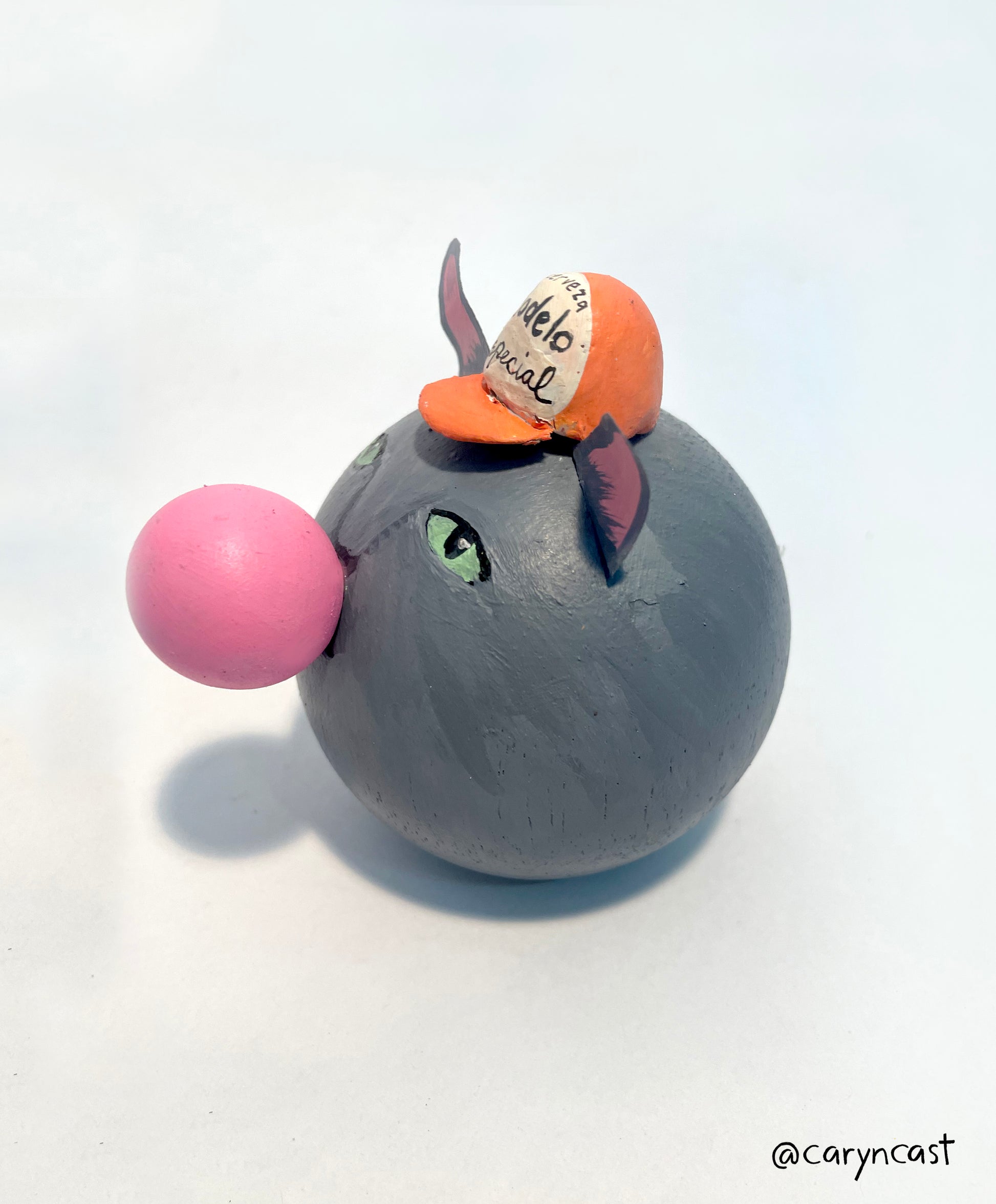 Chipotle is notorious for begging for food 3 hours ahead of time every single day. He prefers to sulk in the corner blowing bubbles all day until it's time : ) This is the spicy companion you need for your desk, bar, office, bookshelf, kitchen counter, or anywhere to keep you company. A handpainted smoking kitty onto a wooden doll head complete with a Modelo trucker hat. He measures 3” in diameter and is a bit weighty and flat on the bottom, so he stays put!