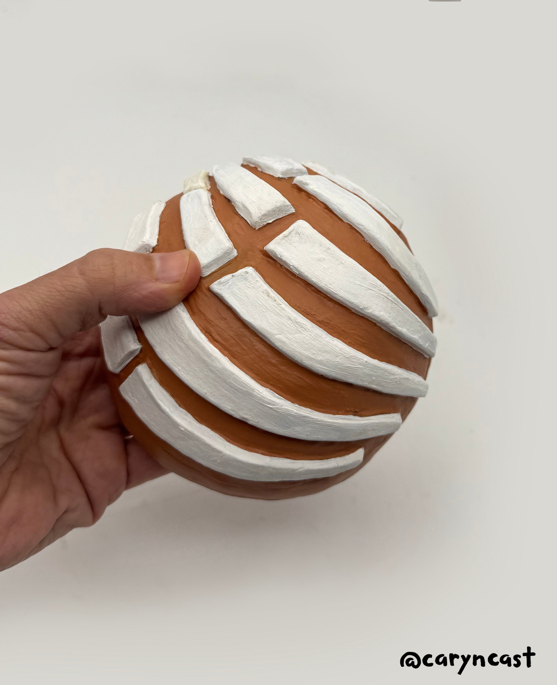 A Mexican concha made of bisque clay, glazed and fired. The top shell opens to reveal it is a concha pillbox (or it can hold other small items instead). The concha pillbox measures 5" around and chills comfortably on your nightstand, bookshelf, coffee table, work desk and more. It is a heavy, weighty piece made of dense bisque clay so it will stay put! It also doubles as a paperweight.