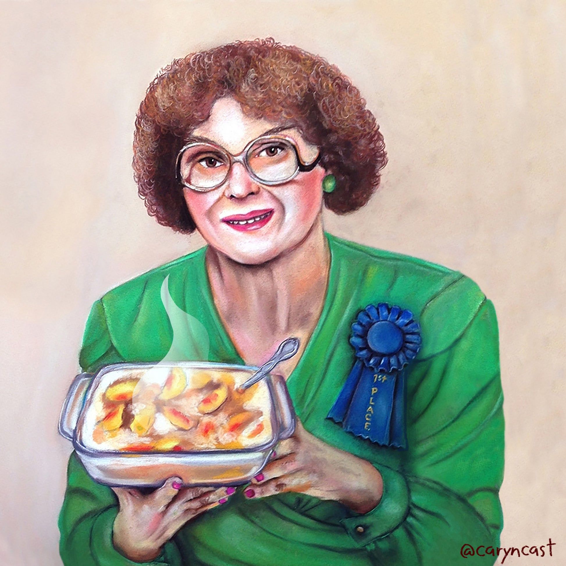 This is a high res print of an original painting created in soft pastels on paper. This is Delores Hardy, proud winner for her peach cobbler in the Jackson County Fair. She is printed on heavy archival Epson hot press paper with a smooth matte finish, pairing with the rich color palette of the fancy green dress and peach cobber. Print comes with a small border around, ready to frame.