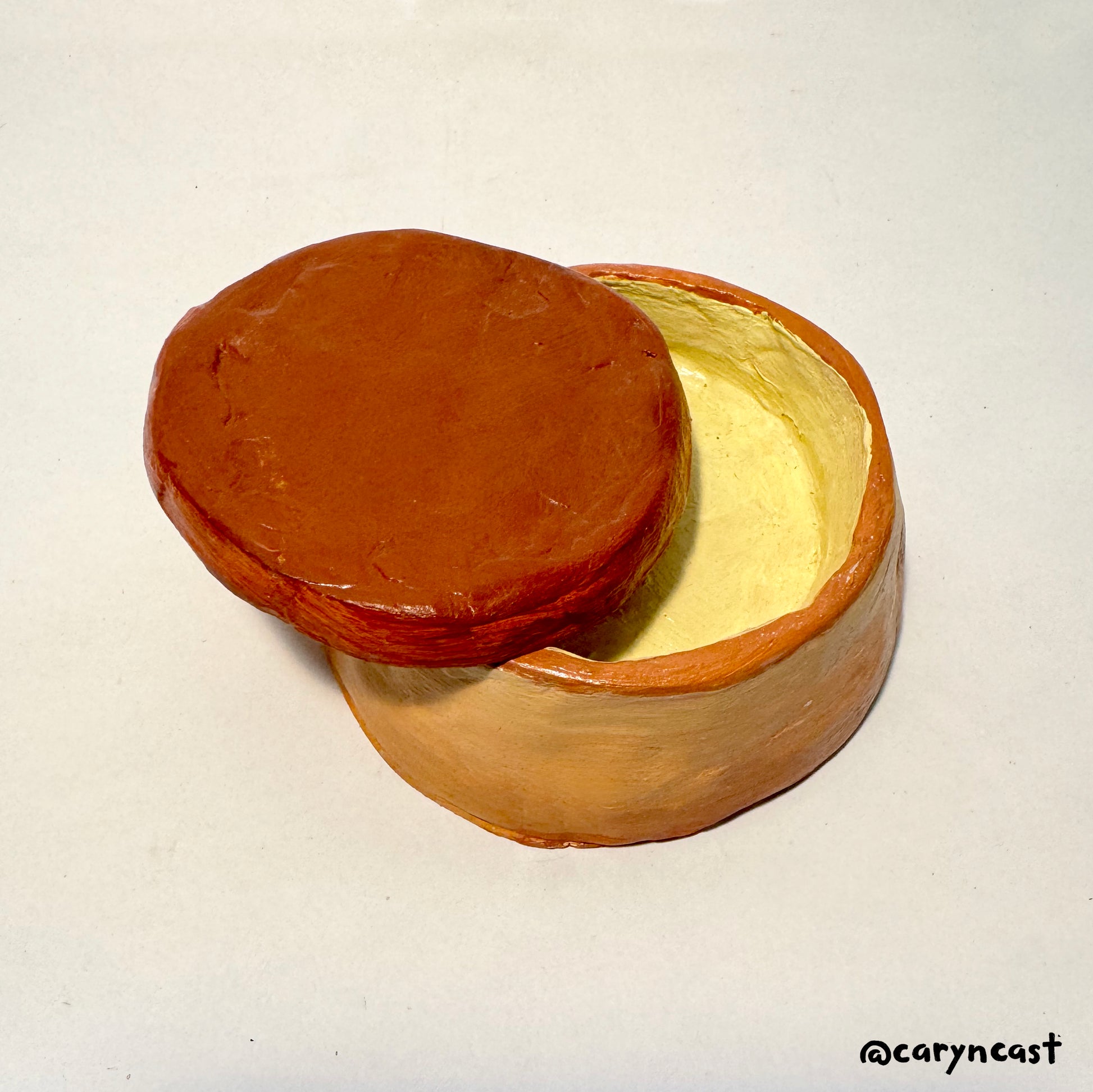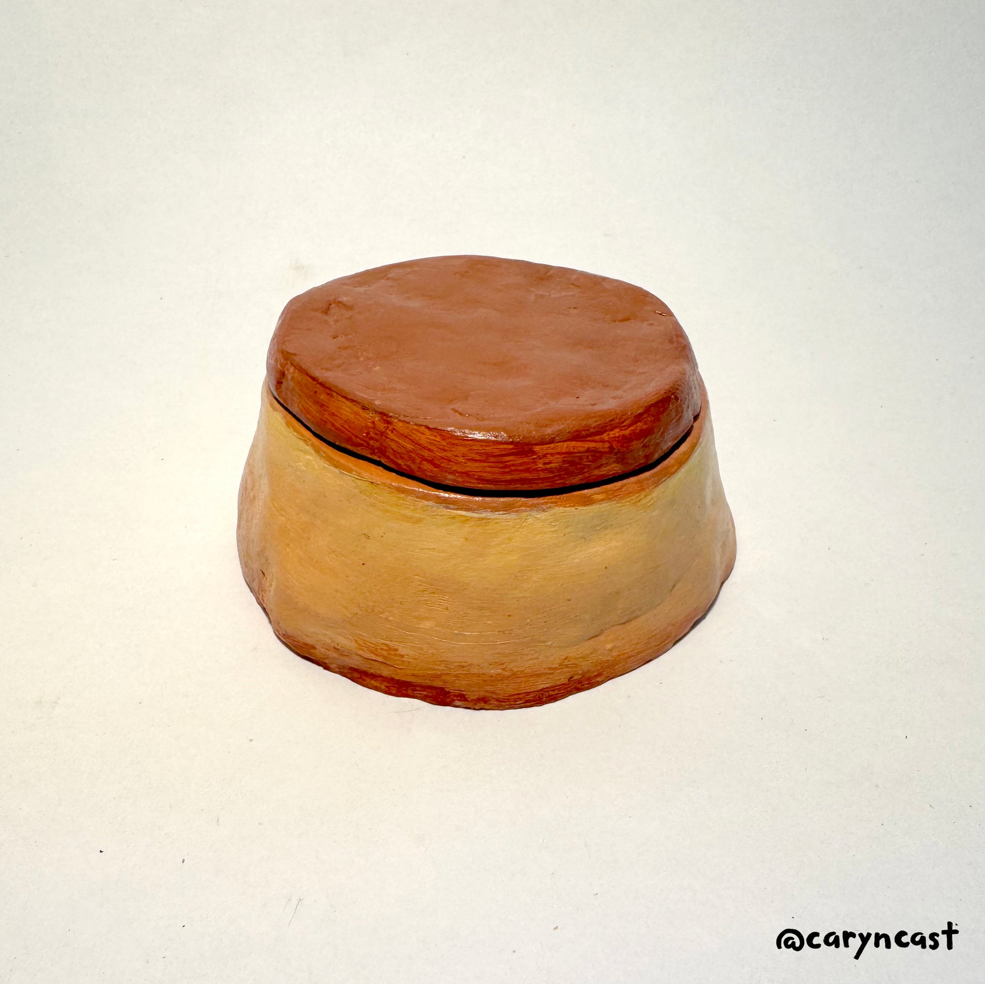 Flan pillbox, a culinary delight to secretly hide your pills, jewelry, trinkets or drugs. The custardy top of the flan comes off to reveal a hidden compartment underneath. Flan measures 4” in diameter and chills comfortably on your nightstand, desk, bookshelf, coffee table, or any flat surface to keep you company. It is a bit heavy, so it also can work as a paperweight.