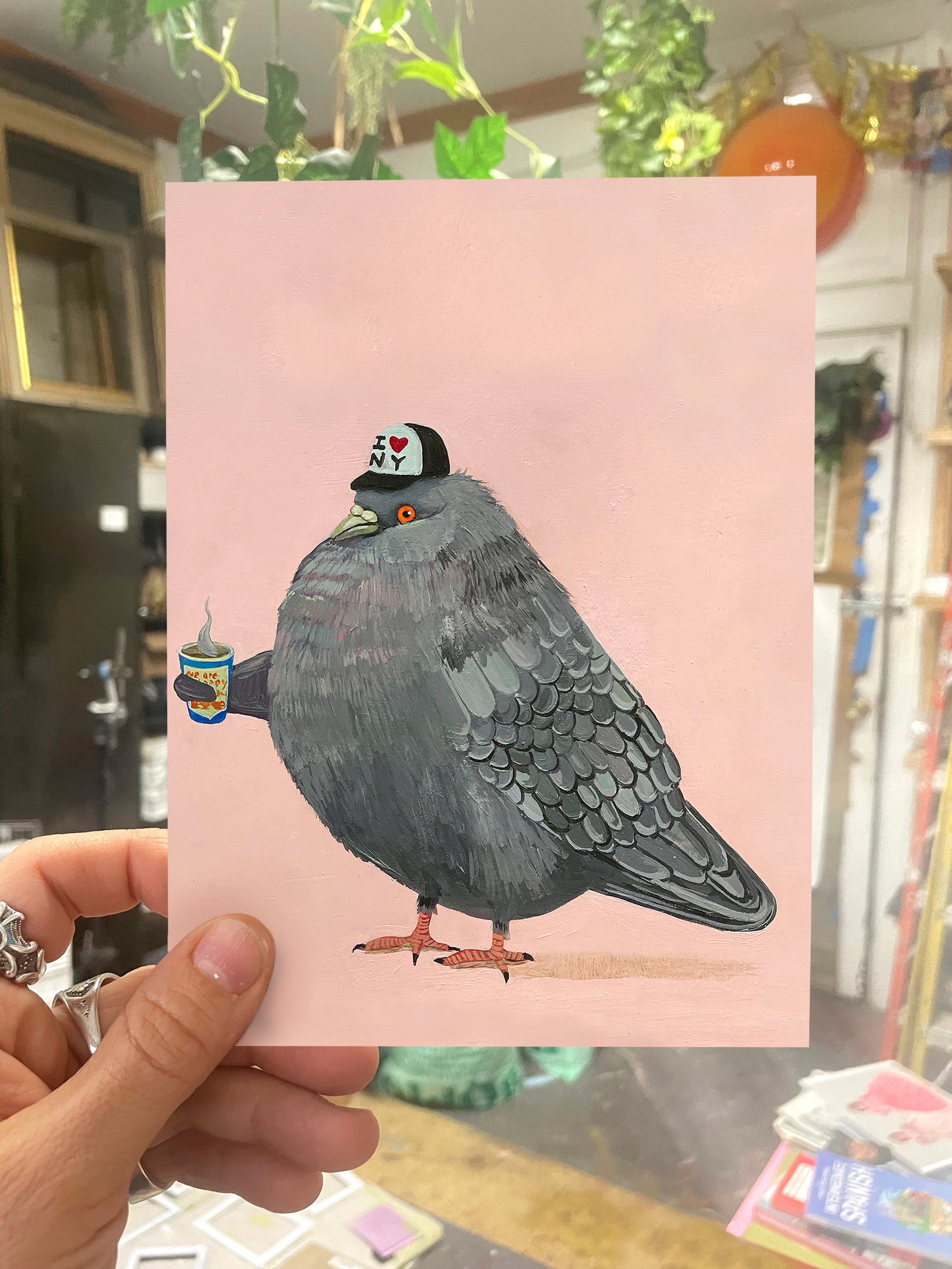 The Fluffy Pigeon is in his element, sipping on coffee all day. This greeting card is printed on Epson archival hot press cardstock and won’t fade one bit. Card measures 5" X 7" and is blank on the inside. Fluffy Pigeon card comes paired with a recycled paper envelope.