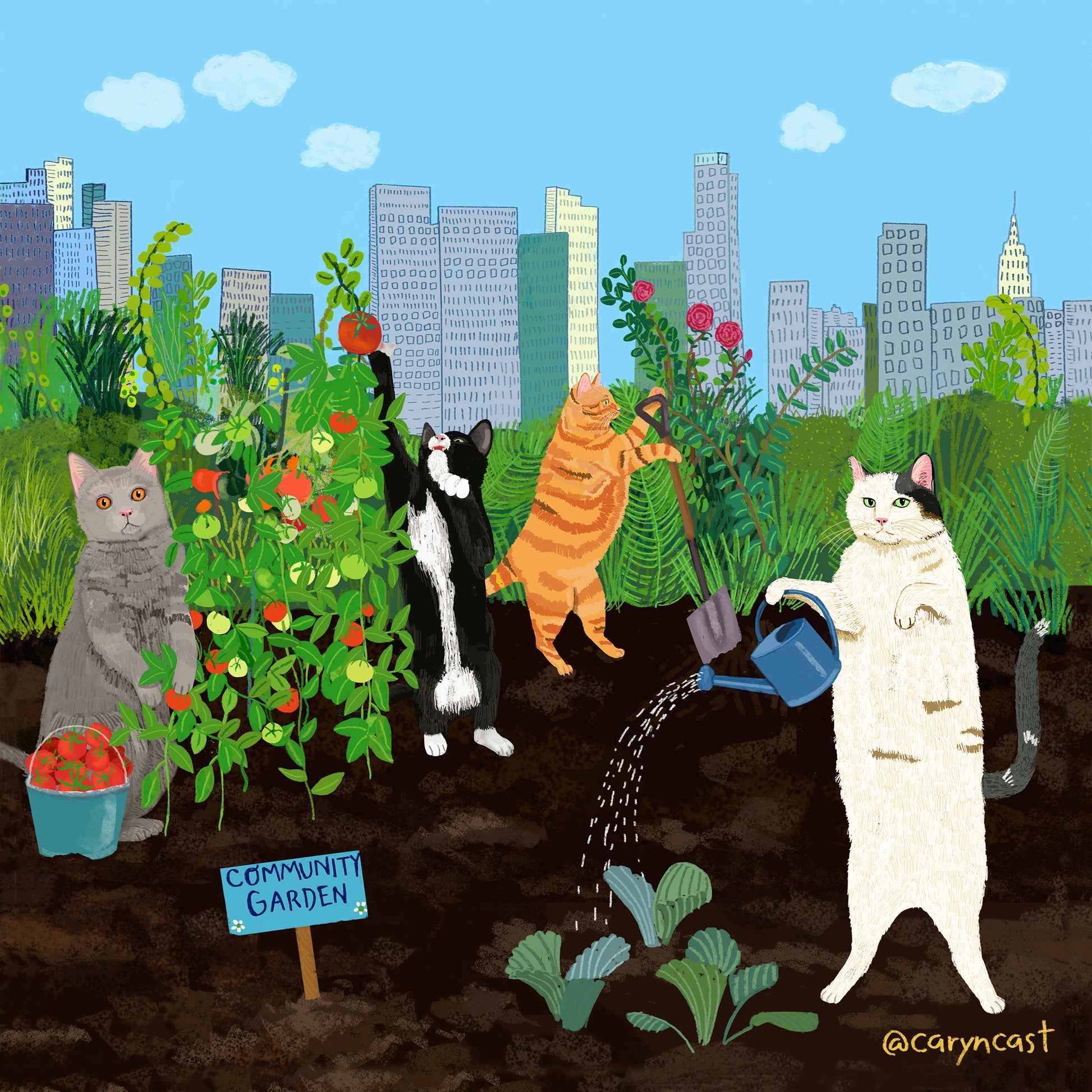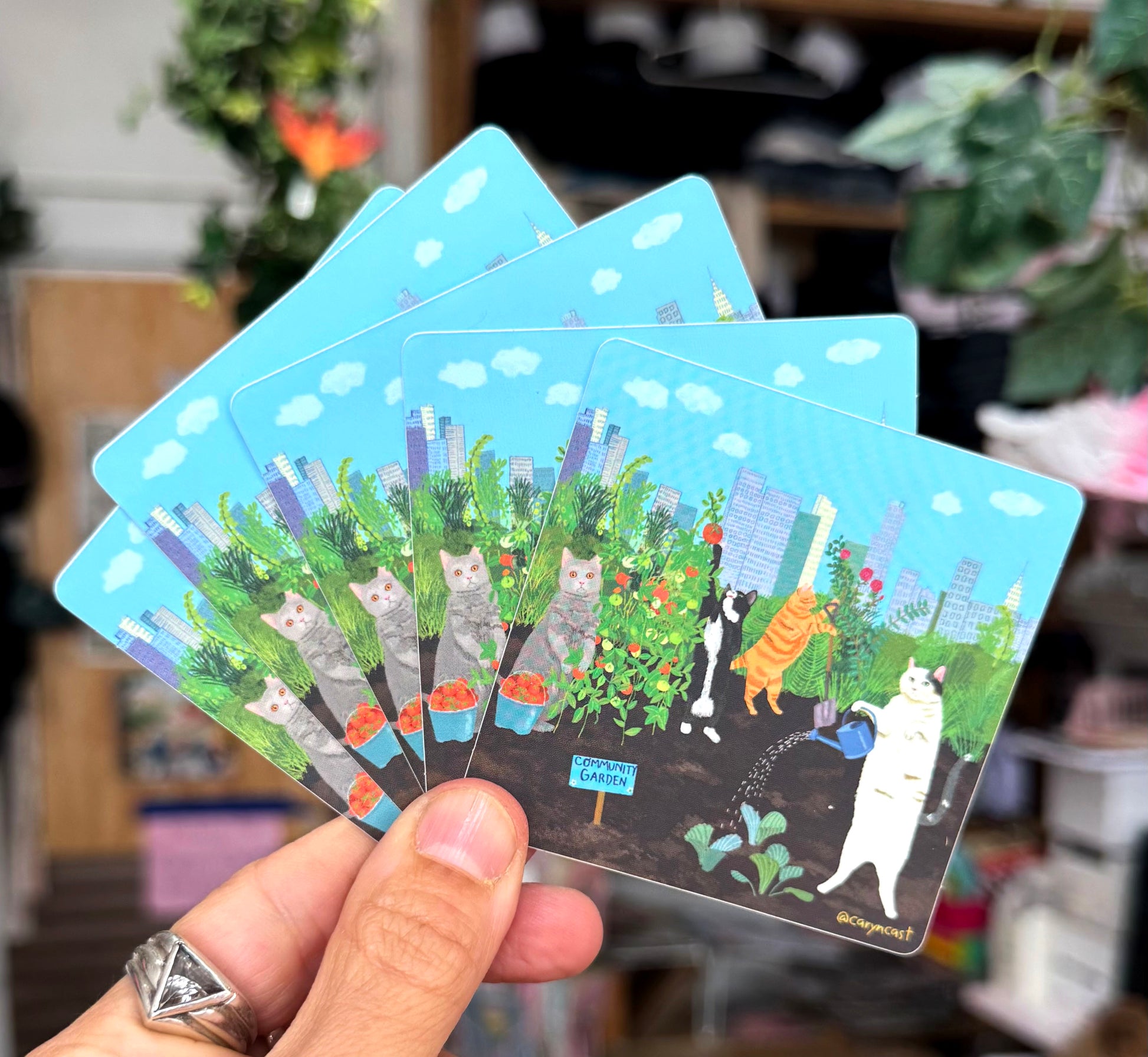 Cats make great gardeners. These cats on hind legs have taken over the community garden. Sticker is sized at 3” X 3” and perfect for laptops, phones, bathroom walls, lockers, and more!