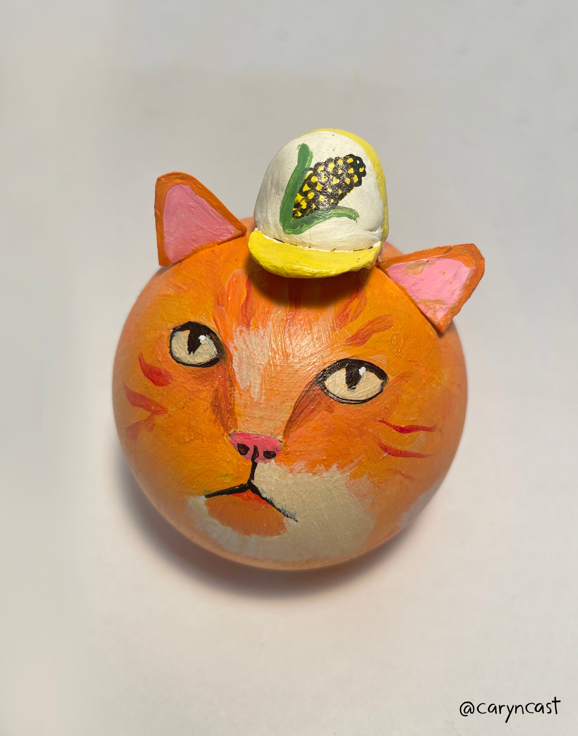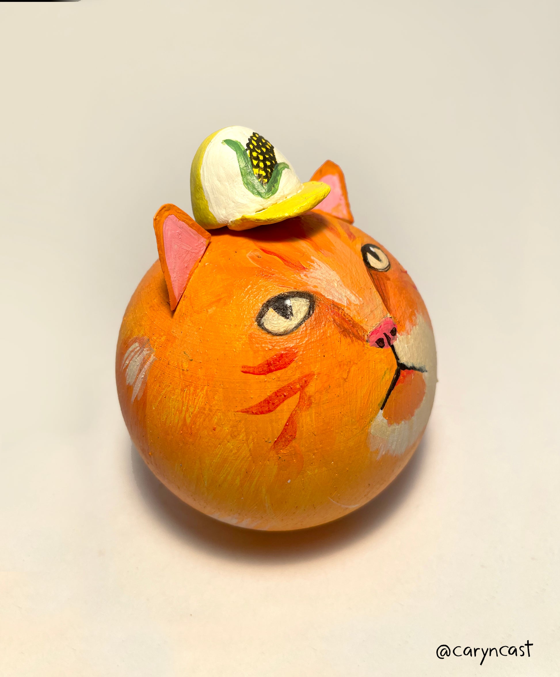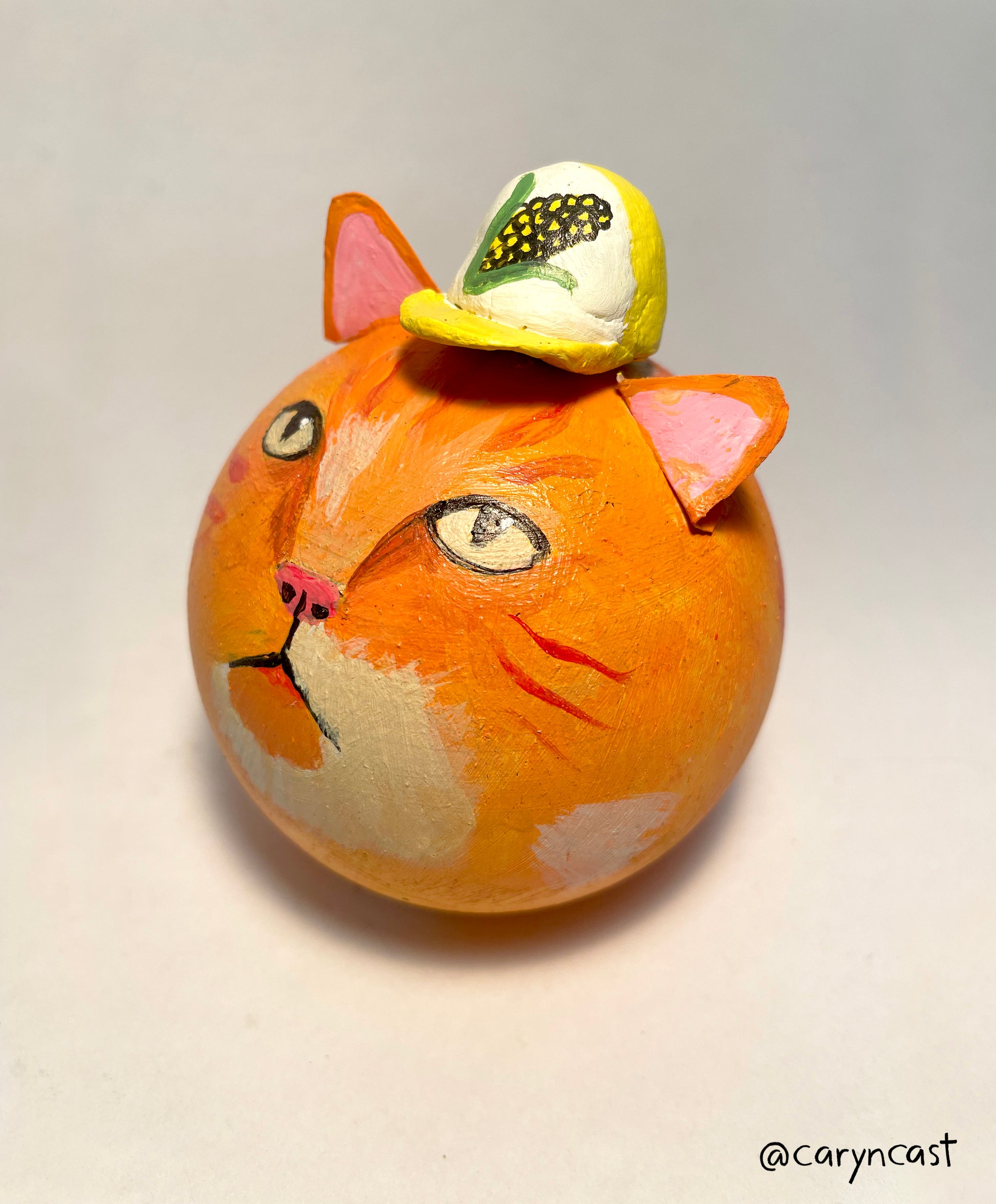 Grits the cat stays in a fine mood by sipping on a '40 all day. He is the perfect companion for your desk, bar, office, bookshelf, kitchen counter, or anywhere to keep you company. A handpainted smoking cat on a wooden doll head complete with a winning beer hat. He measures 3” in diameter and is a bit weighty and flat on the bottom, so he stays put!
