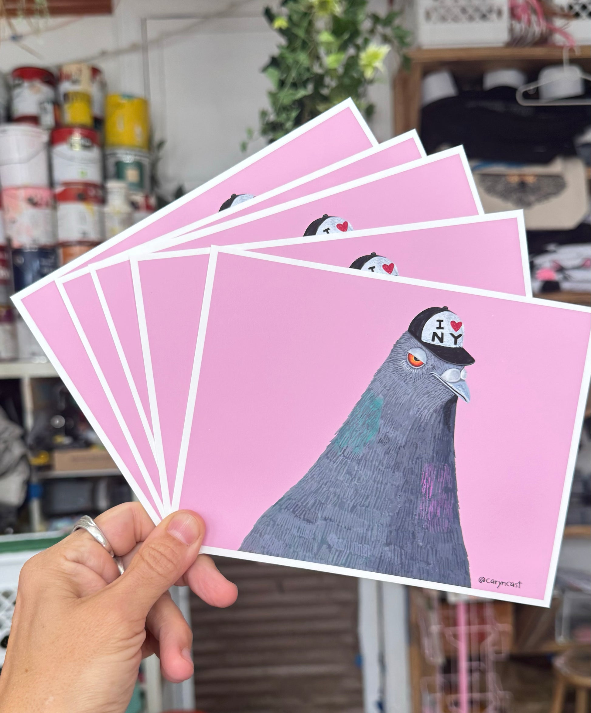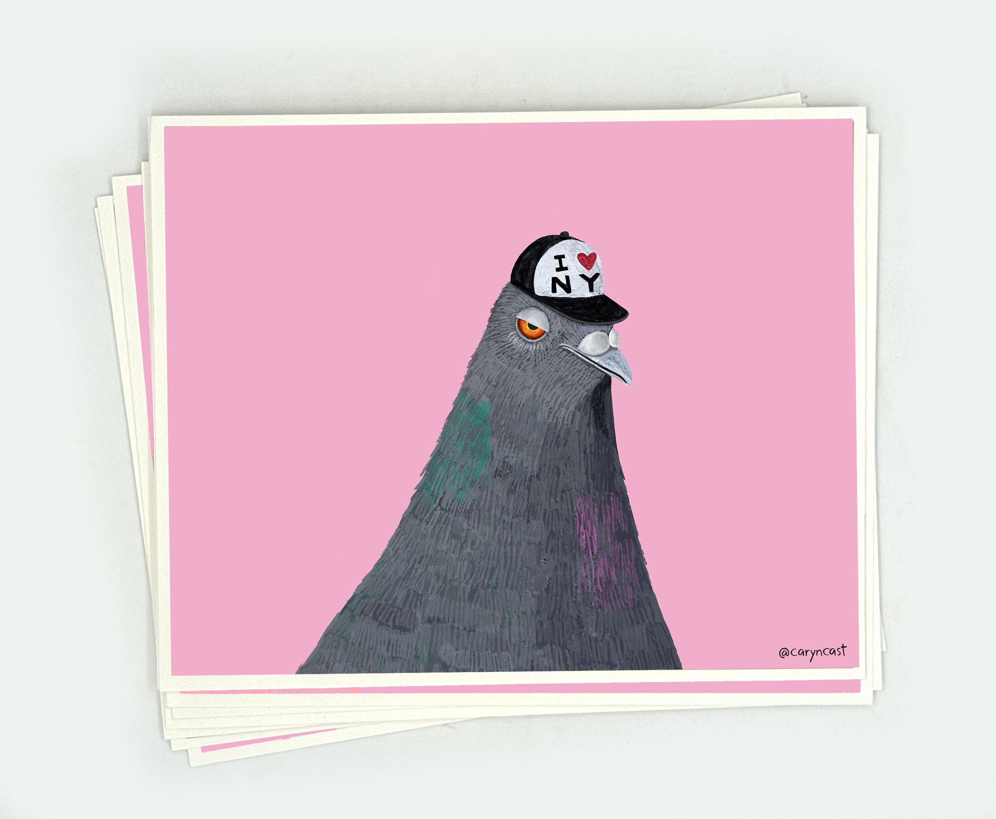 This is the first original iteration of Jerry the Pigeon. Also known as the Grumpy Pigeon, Jerry has inspired all the pigeon art on this page. While he appears grumpy, he is actually very happy and content; he is just a new yorker : ) This postcard is printed on Epson hot press acid-free archival paper and won't fade one bit! Postcard comes double sided with room for inscription, stamp and address. Available as a single postcard and as a set.