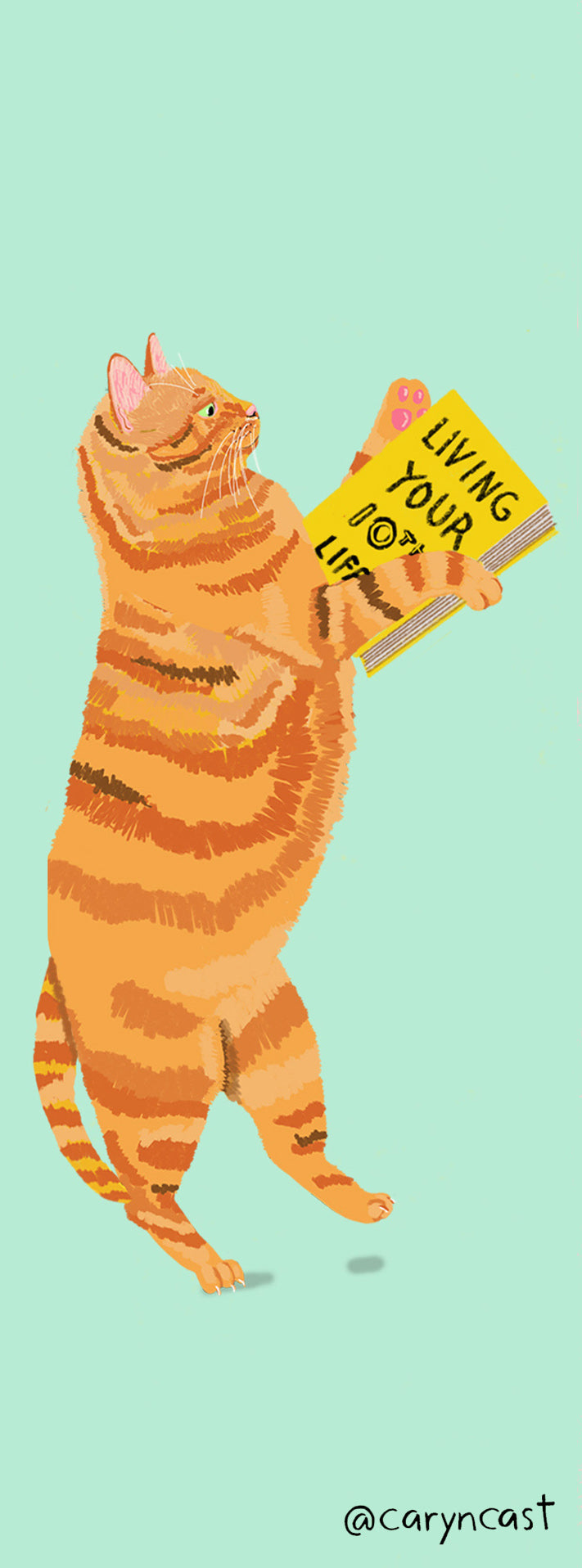 A well-read tabby cat currently learning the abilities on how to live forever. Bookmark is printed on thick hot press Epson paper and measures 2.5” X 6.” Kitty bookmark is wrapped in clear biodegradable sleeve. Perfect for your cat bookworm friend.