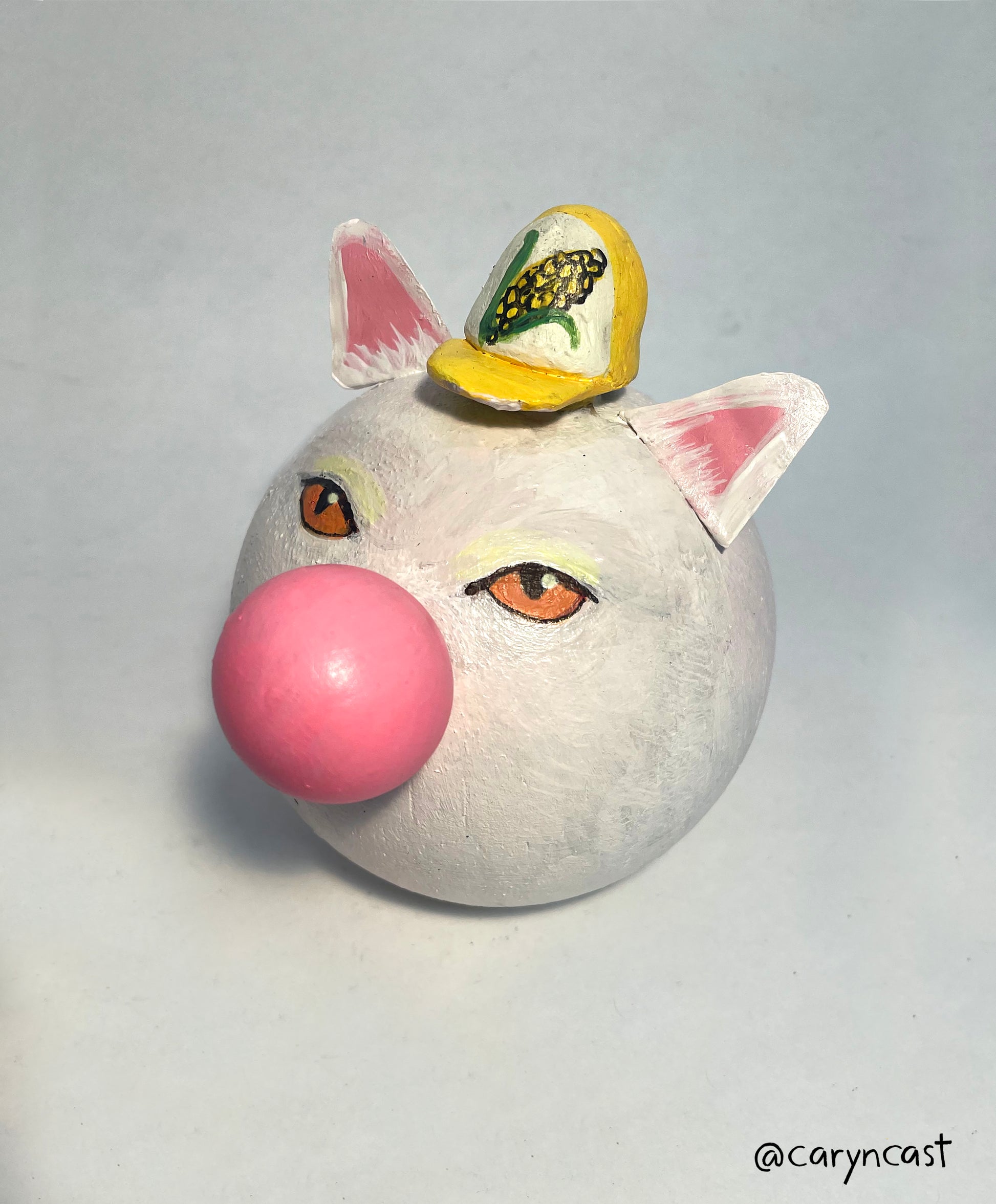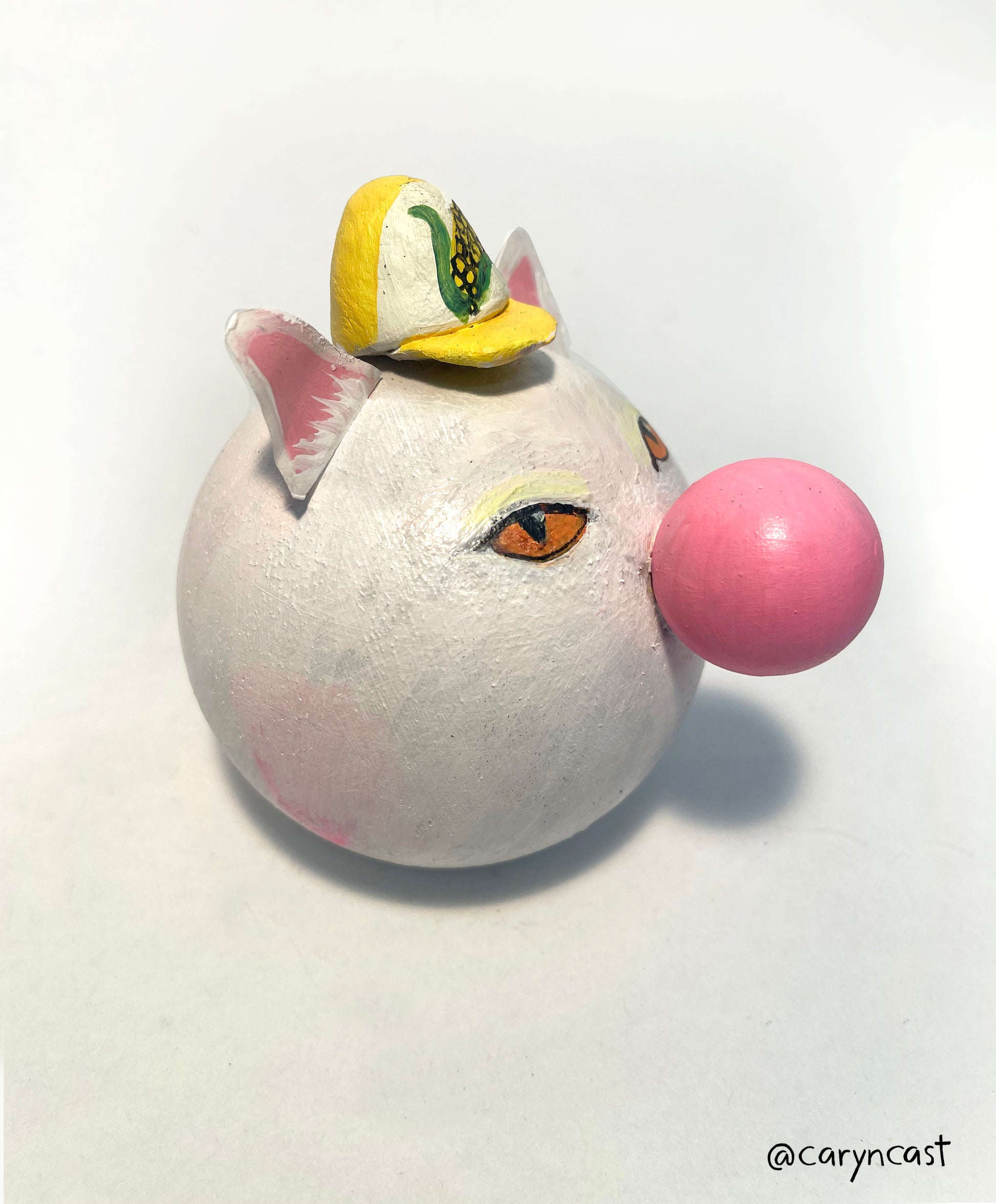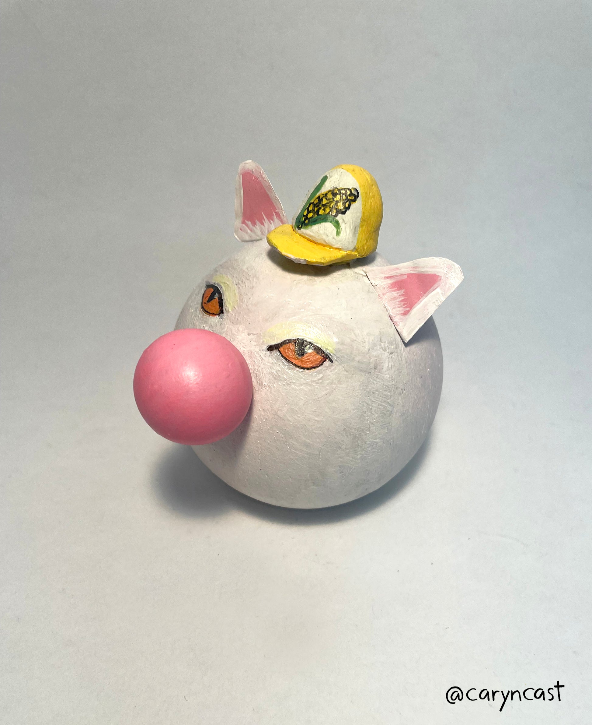 Lulu likes to hang out in the corn field blowing bubbles all day. She is the perfect companion for your desk, bar, office, bookshelf, kitchen counter, or anywhere to throw some serious shade. A handpainted smoking cat on a wooden doll head complete with a winning trucker hat. She measures 3” in diameter and is a bit weighty and flat on the bottom, so she stays put!