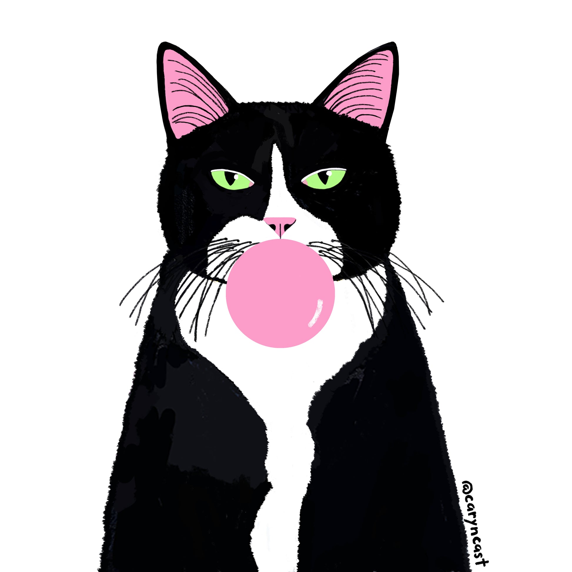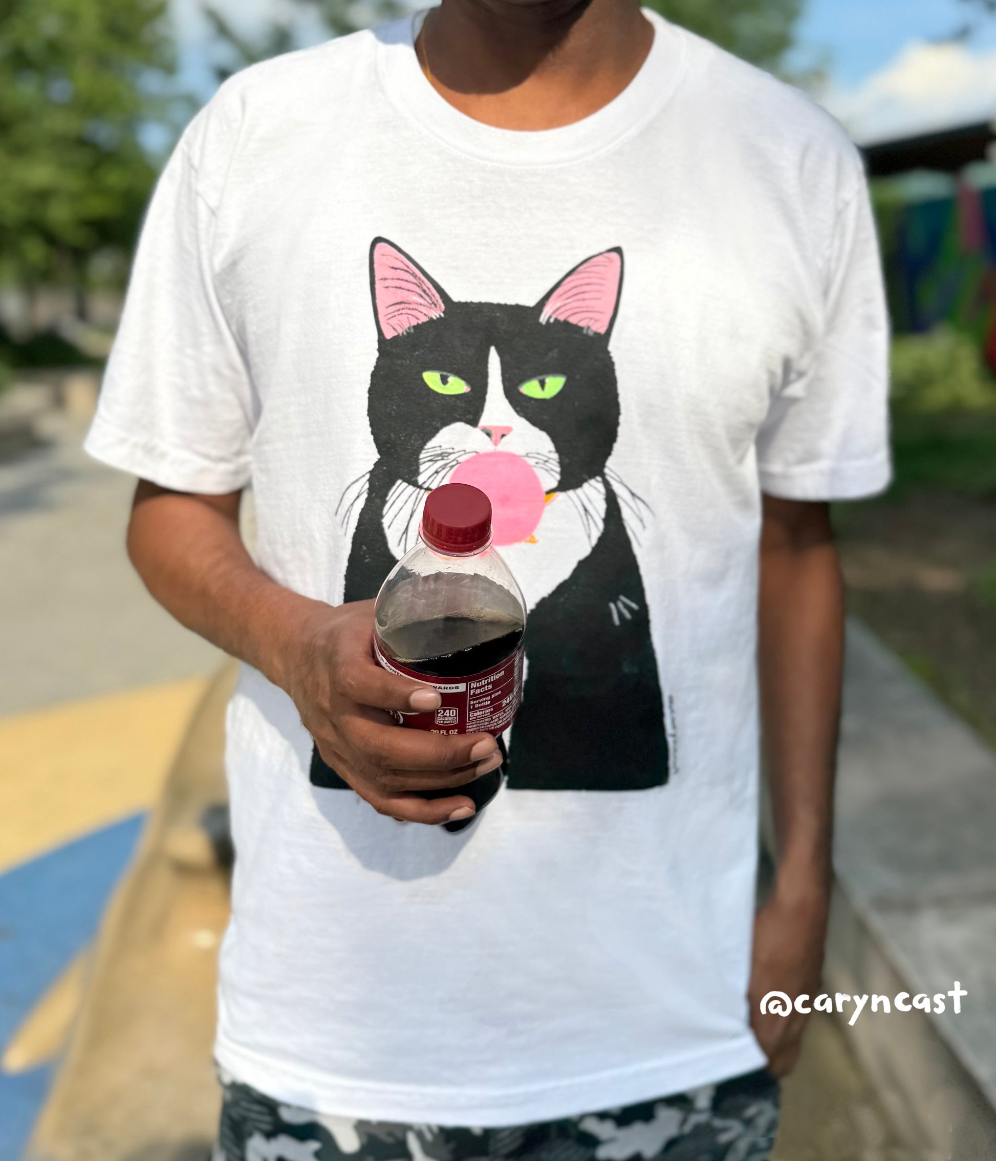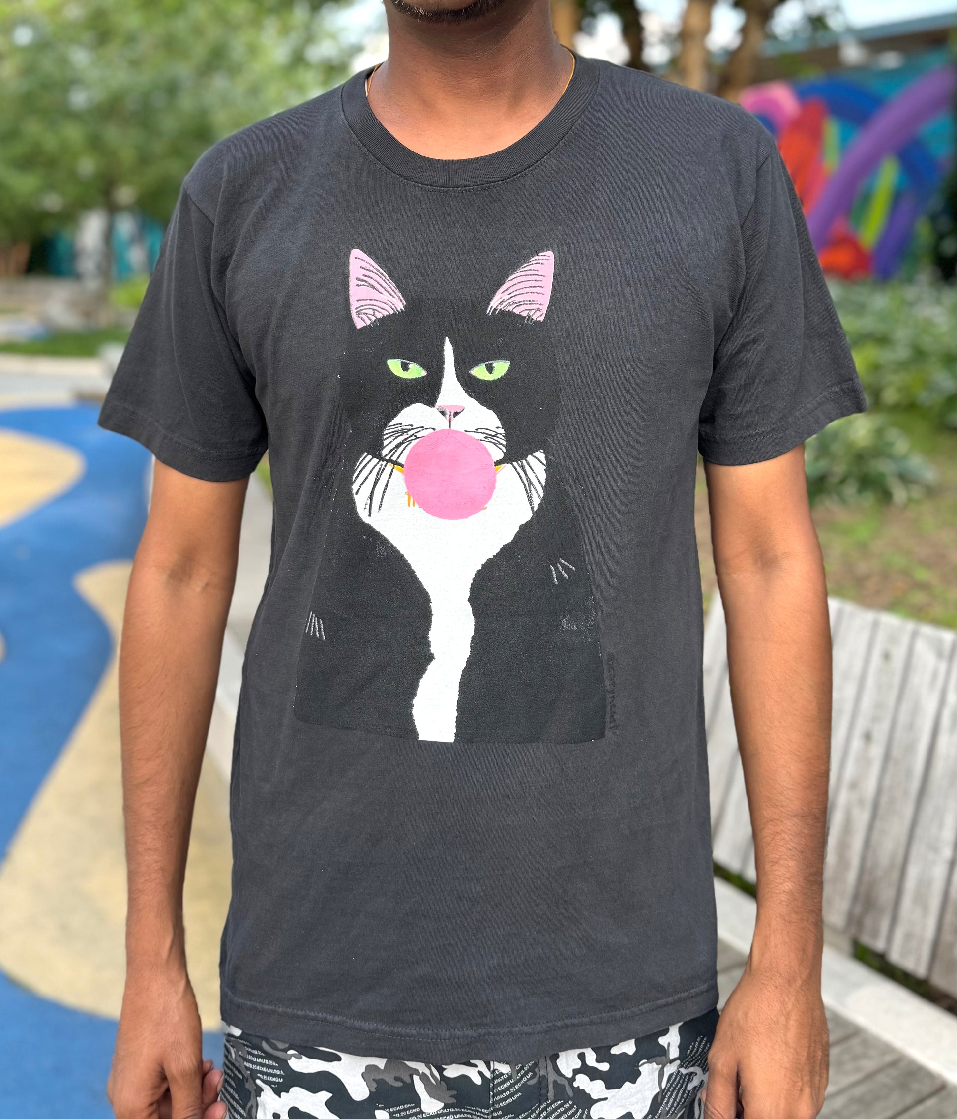Mr. Snacks is blowing bubbles on the job, again. This is an original illustration created by Caryn Cast as part of the bodega kitty mural painted in Williamsburg, Brooklyn. This kitty was screenprinted locally in NYC on the trash tee made by Everybody World. It’s a thick cotton tee spun from recycled cotton recovered from landfills. Now available in white and charcoal gray! This is a special edition tee and in limited supply.
