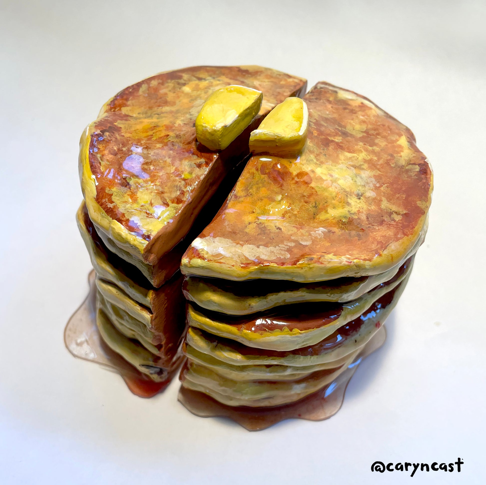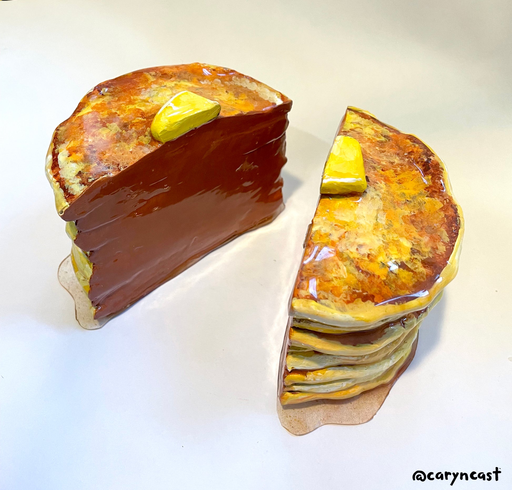 It’s breakfast 24/7. These are pancake bookends sculpted from clay, handpainted and coated in shiny resin. As a final touch, they were dripped with syrup-color resin to make them look fresh. The pancakes as a whole measure 5” in diameter and are 4” tall. They are heavy and solid and definitely weighty enough to hold your books in place.
