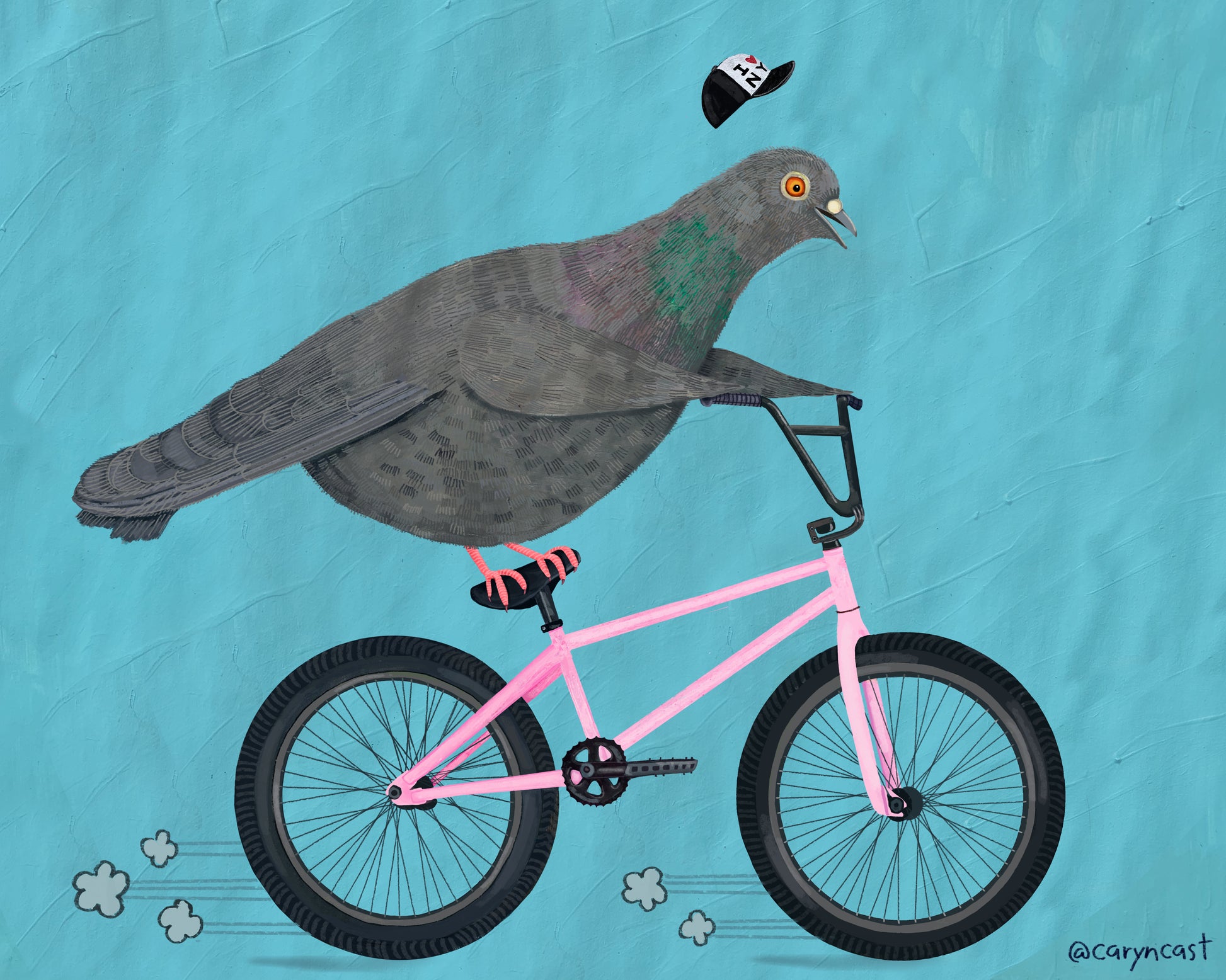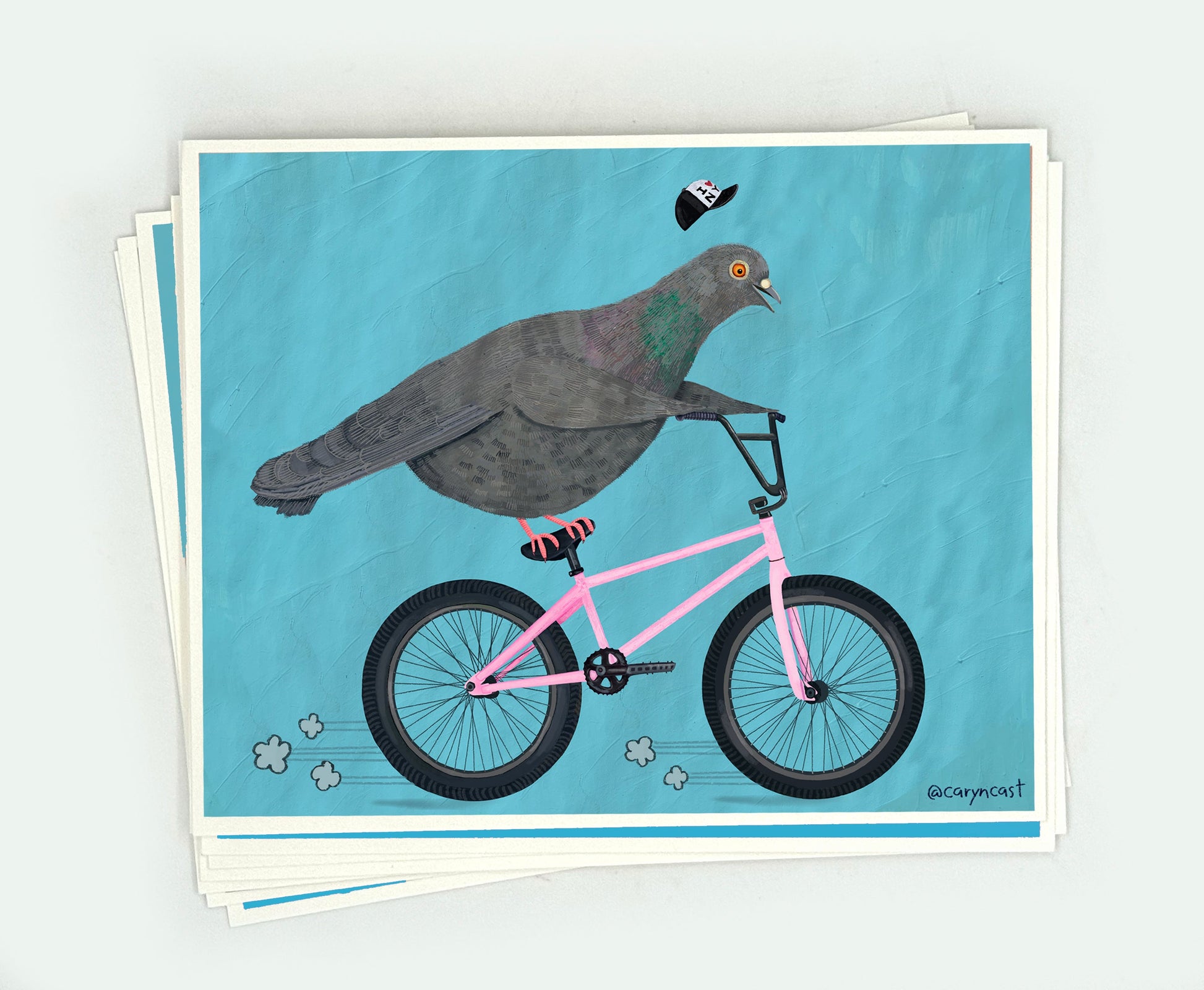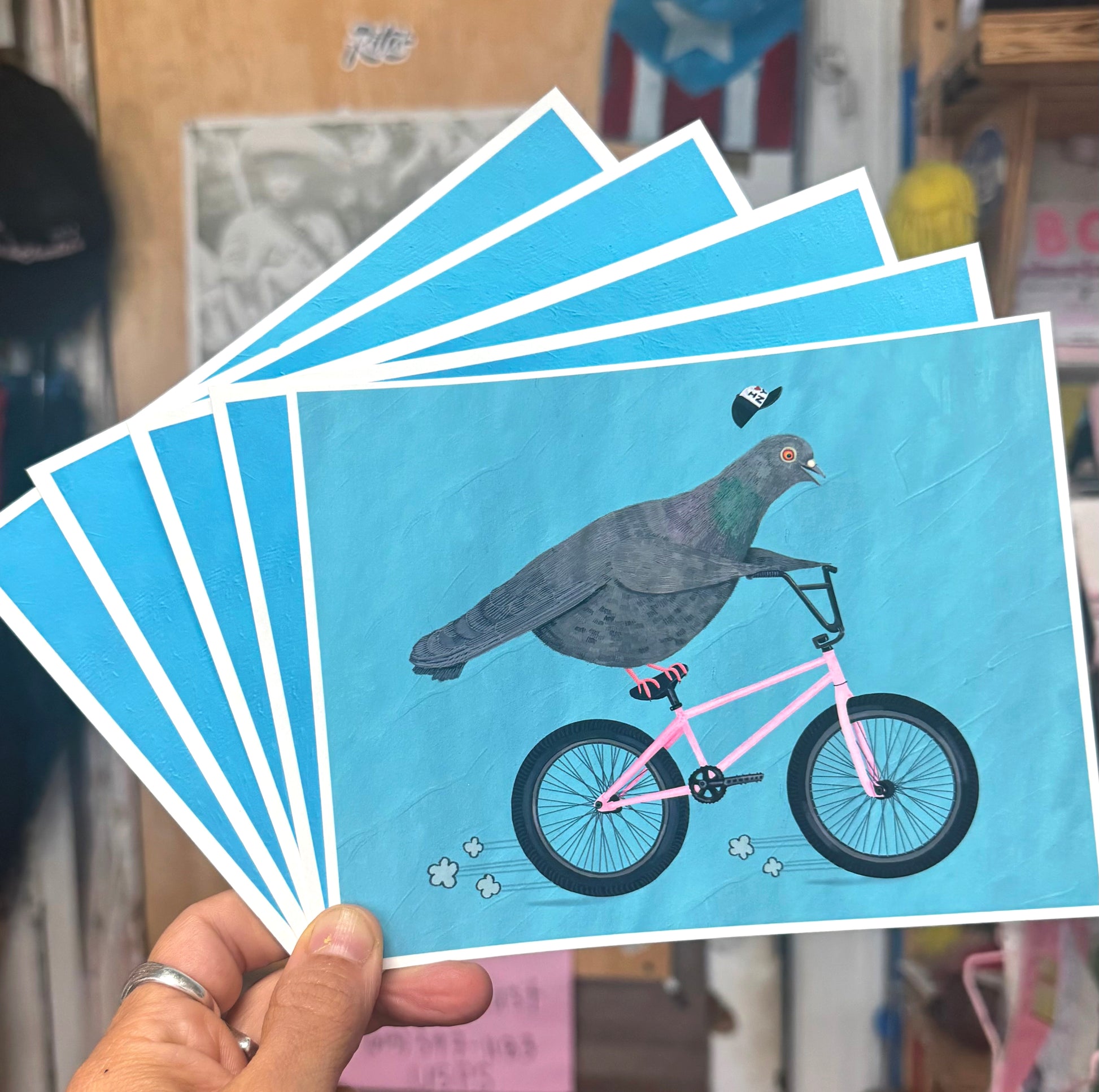 Pigeon just got a new pink bike. This postcard is printed on Epson hot press acid-free archival paper and won't fade one bit! Postcard comes double sided with room for inscription, stamp and address. Available as a single postcard and as a set.