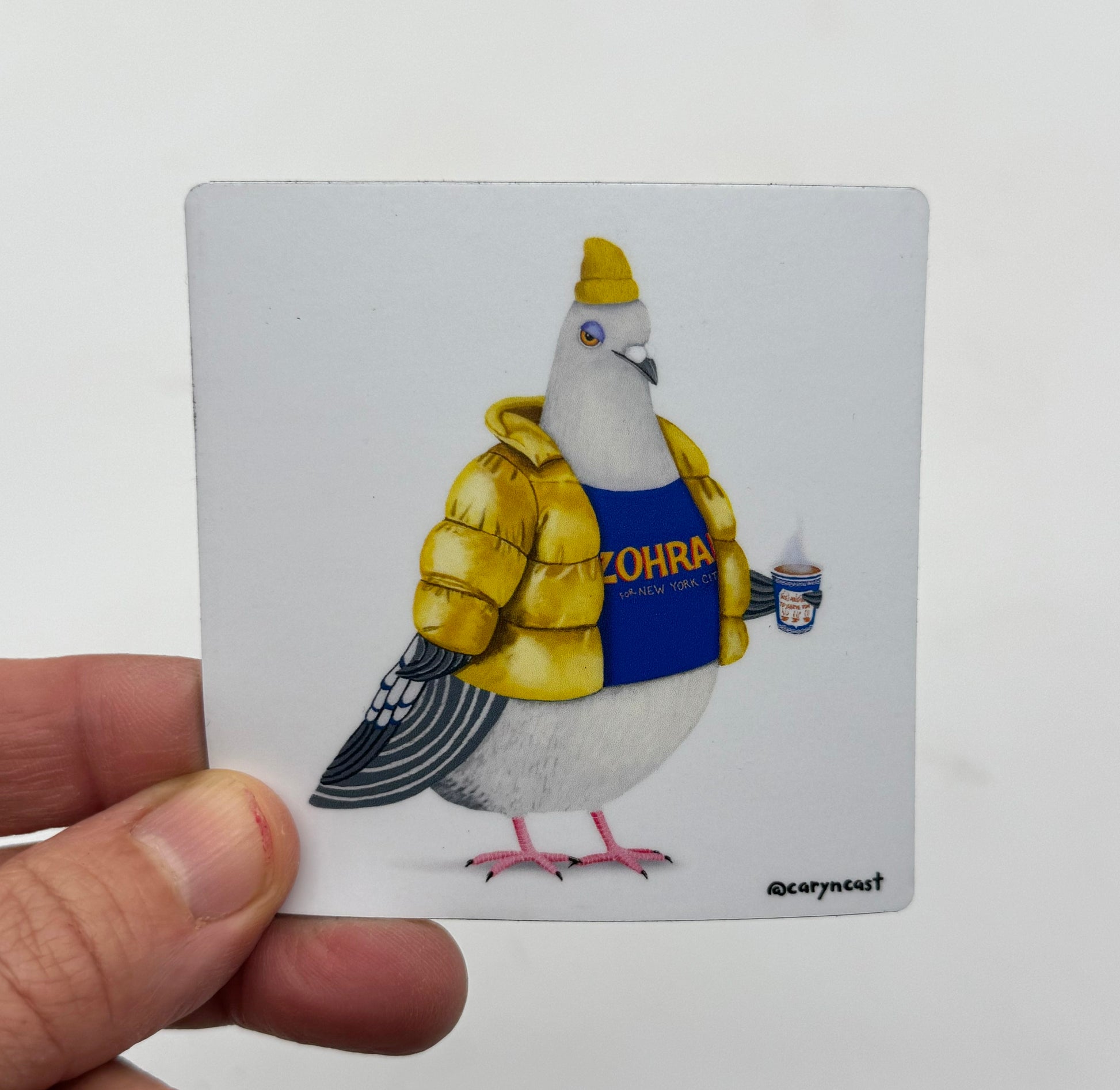 The Winter Jerry for Zohran magnet is a durable magnet sized at 3” X 3.” It features Jerry sipping his nyc coffee in his new yellow puffer coat. This magnet has softly rounded edges. Perfect for some celebratory refrigerator bling or any metallic object in case you need a sweet little pick-me-up.