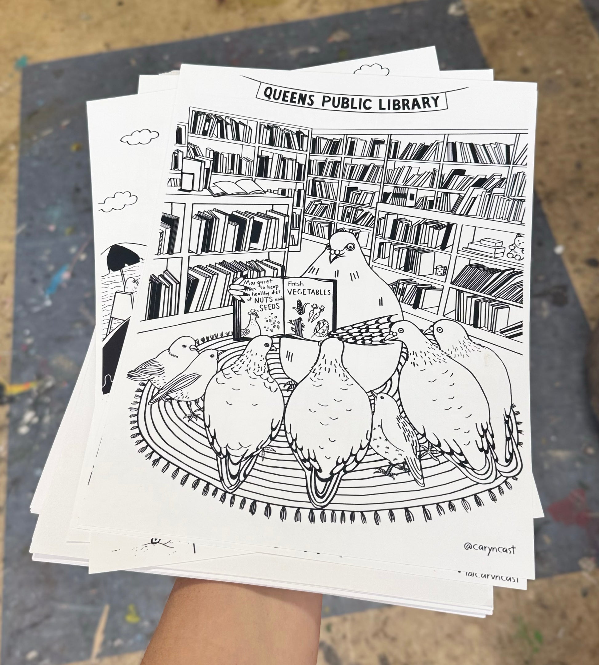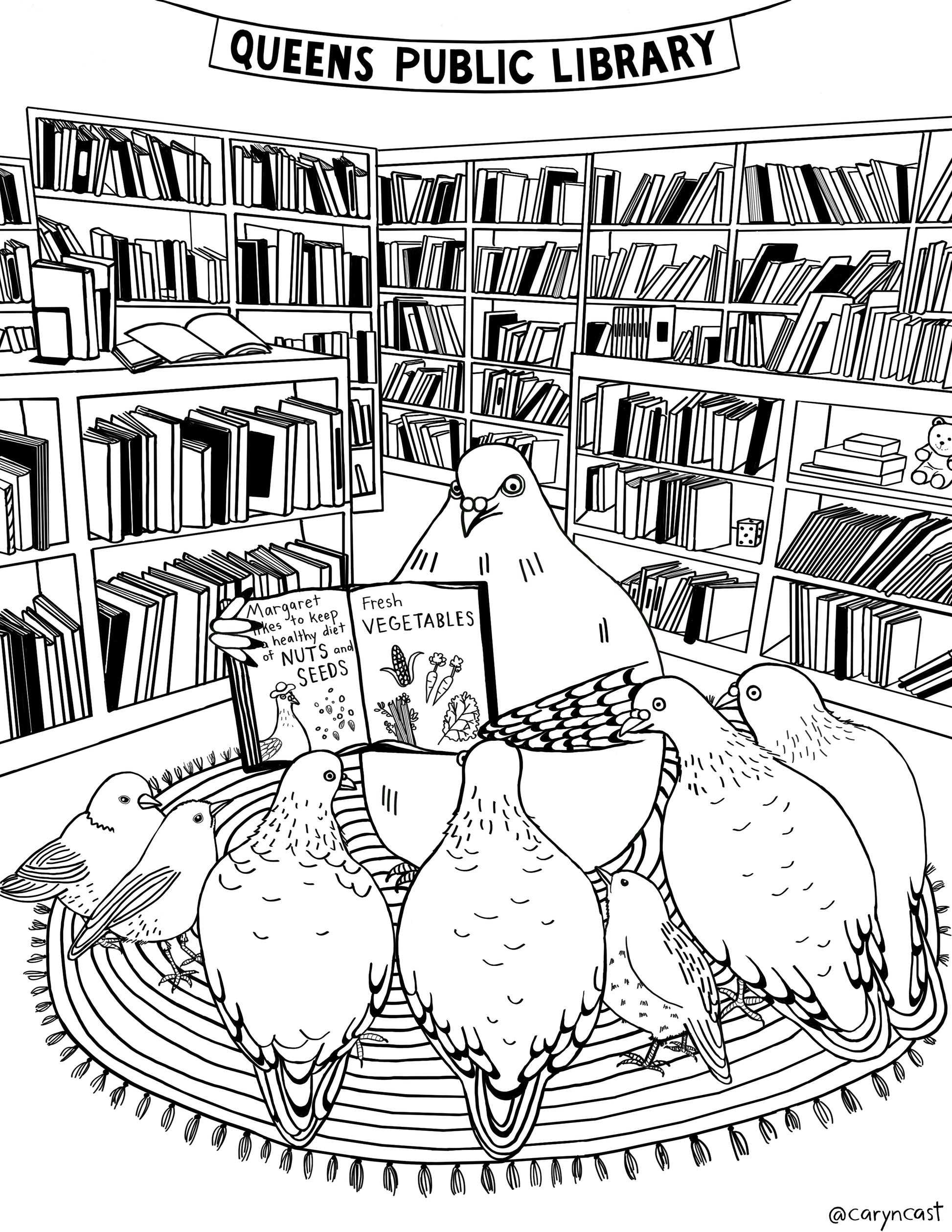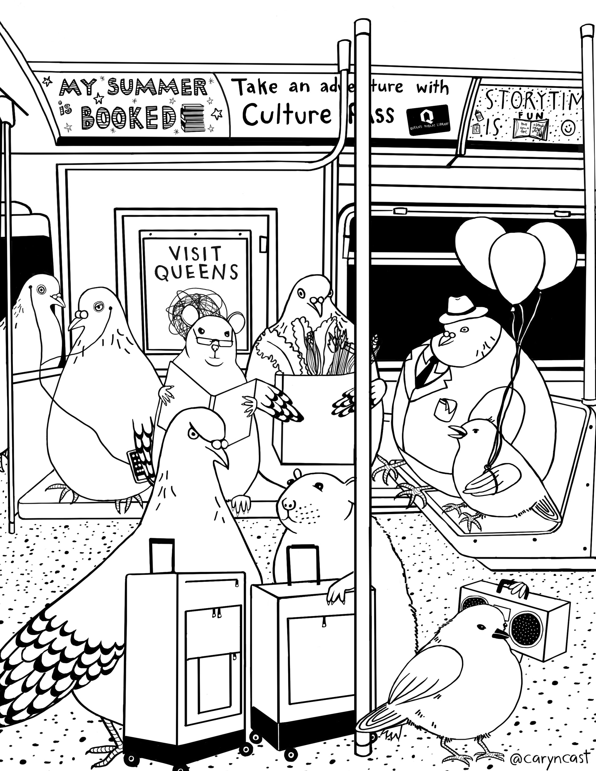 Coloring sheets of pigeon adventures in Queens, NYC. These are custom coloring sheets originally created for the Queens Public Library, and now available individually or as a 3-pack set. Printed on quality acid-free card stock paper and ready to frame once finished.