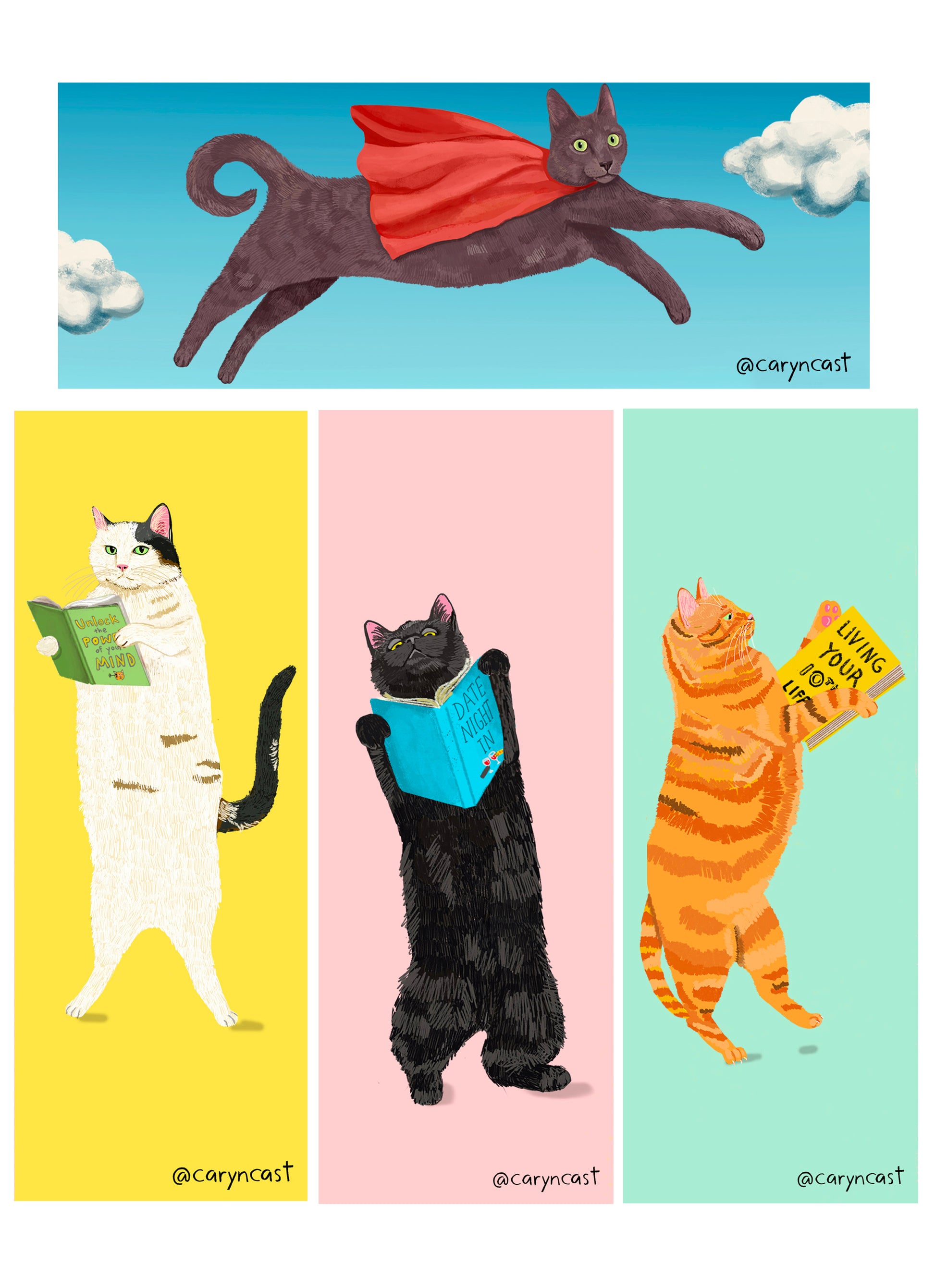 Reading Cats Bookmark set. Featuring the flying kitty and three reading cats. Bookmark set is printed locally in NYC, each on thick hot press Epson paper. Each bookmark measures 2.5” X 6” and is sealed in a clear biodegradable sleeve. Perfect set for your favorite cat lover bookworm!