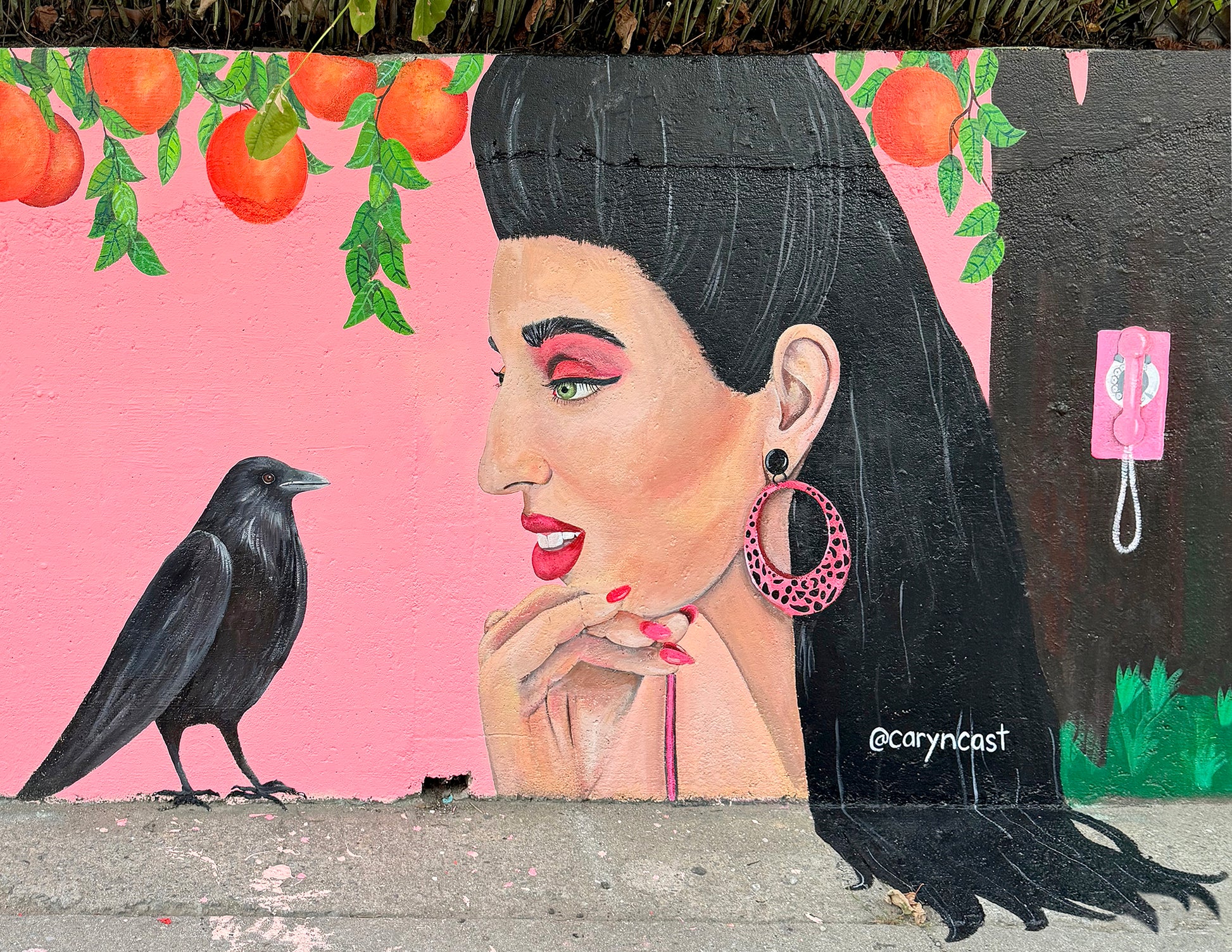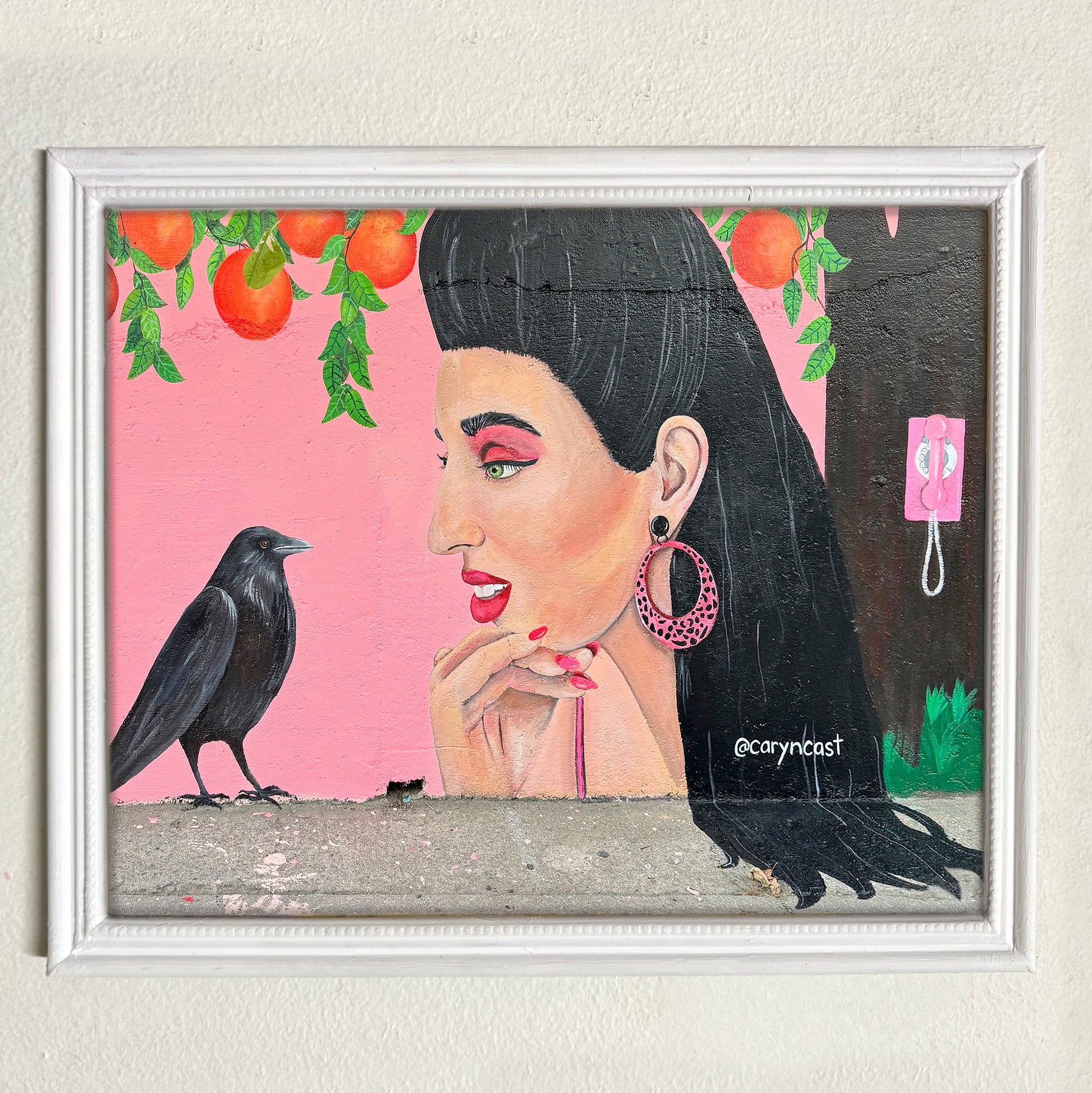 Rossy de Palma, painted next to Eve in the Garden at Welling Court in Astoria Queens. Rossy is featured next to her favorite thing in the world, her crow friend, framed by Valencian oranges. This print was created on Epson archival acid free hot press paper and won’t fade one bit! Comes in an 8.5” X 11” print and framed print.