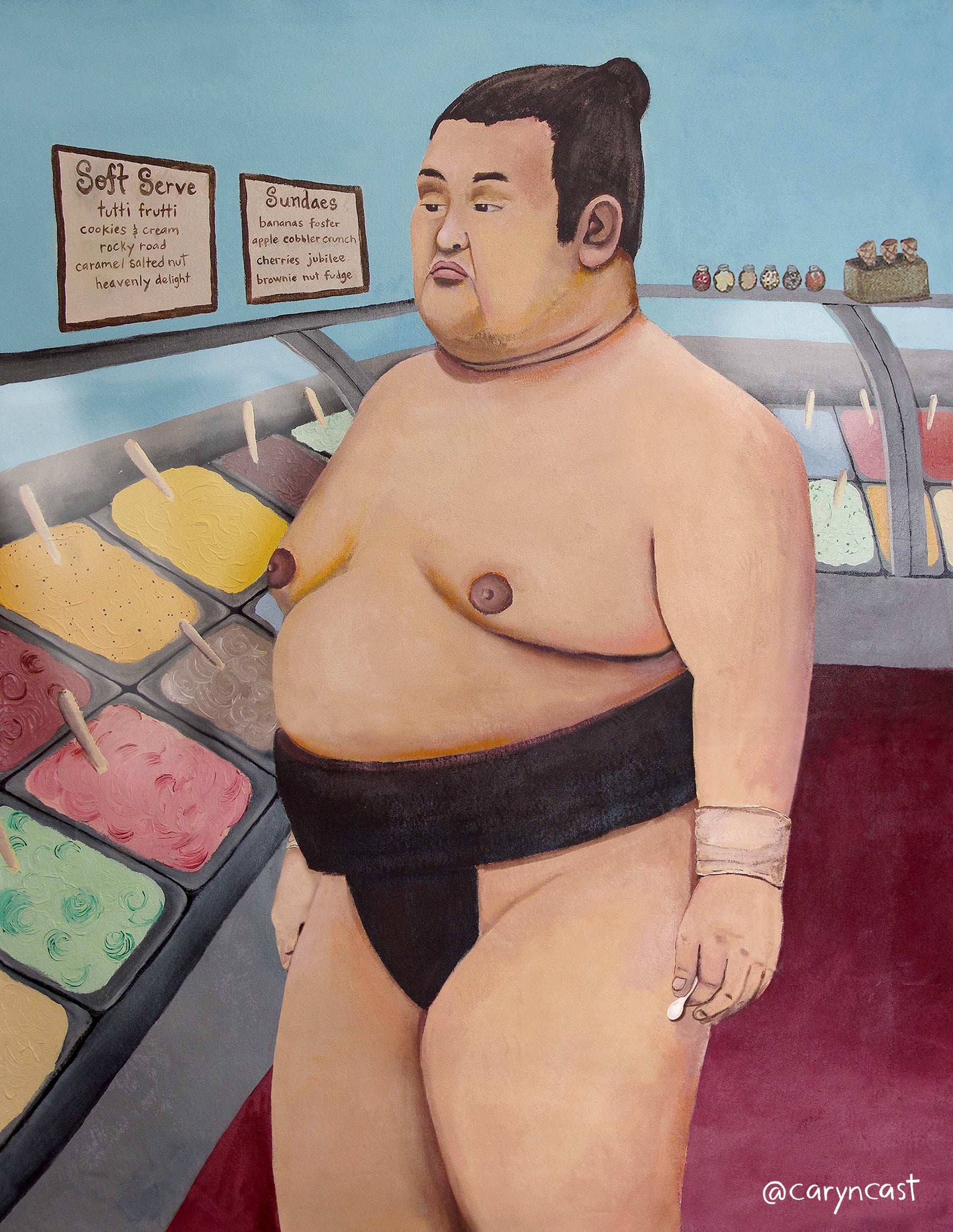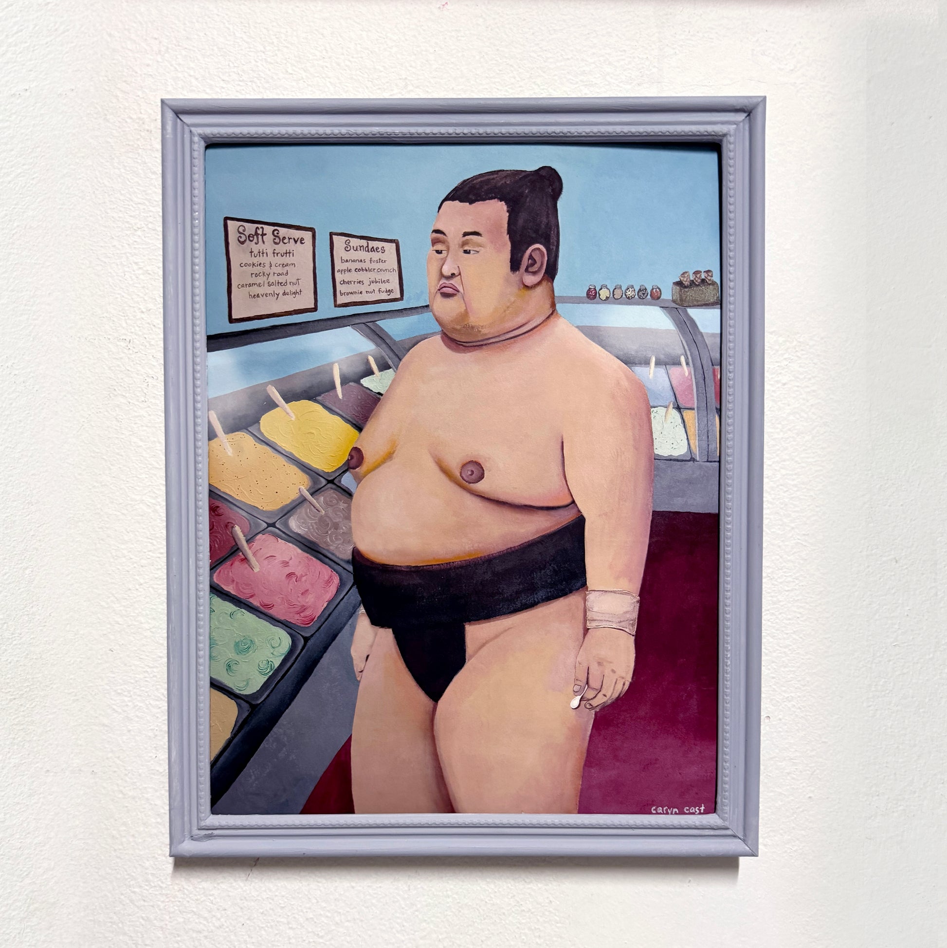 This piece is from the sumo wrestler series, painted in acrylics on unstretched canvas. It is a high res print of the original printed on heavy archival Epson hot press paper, with a smooth matte finish that pairs with the rich color palette of the gelato shop. Print comes with a small border around, ready to frame.