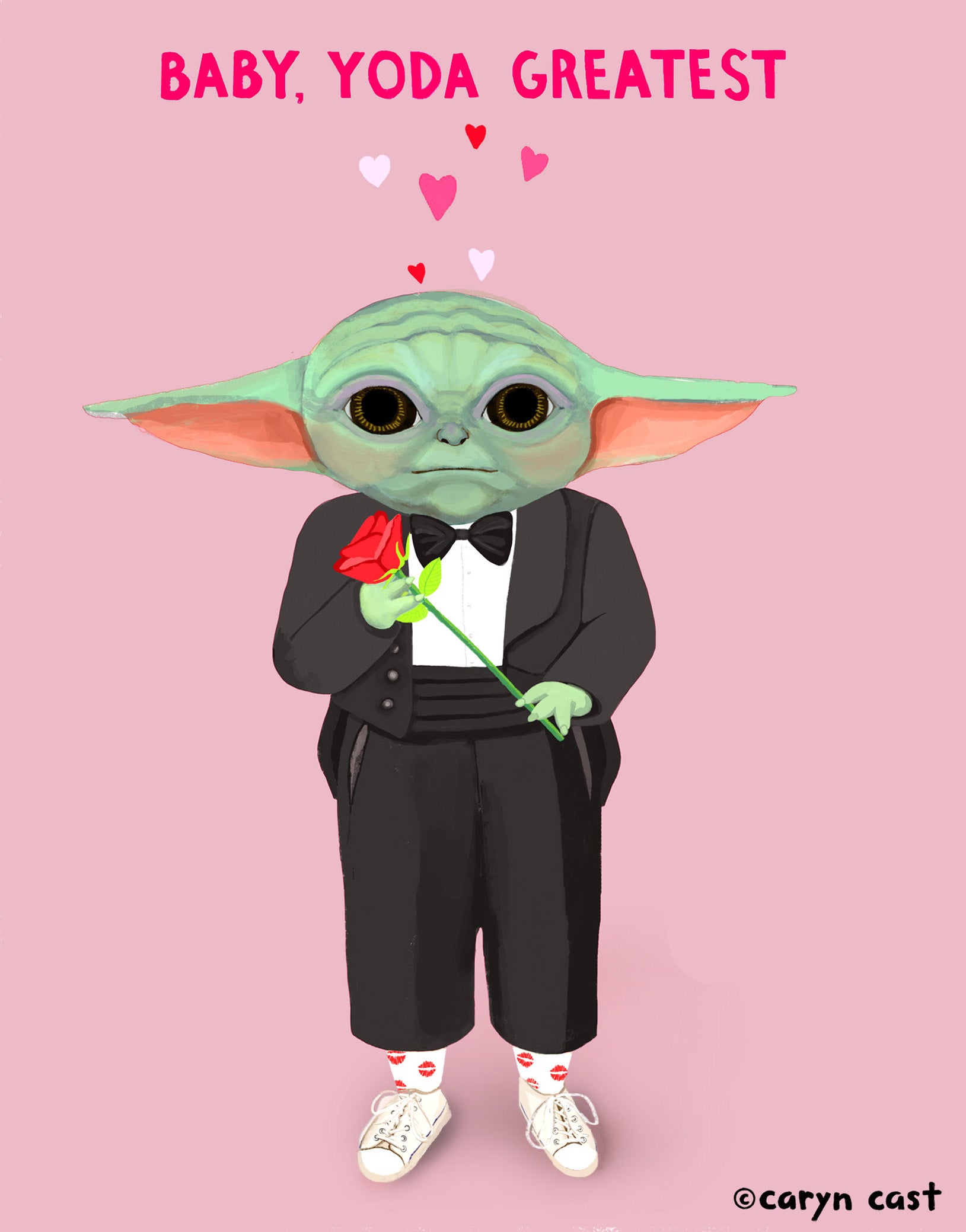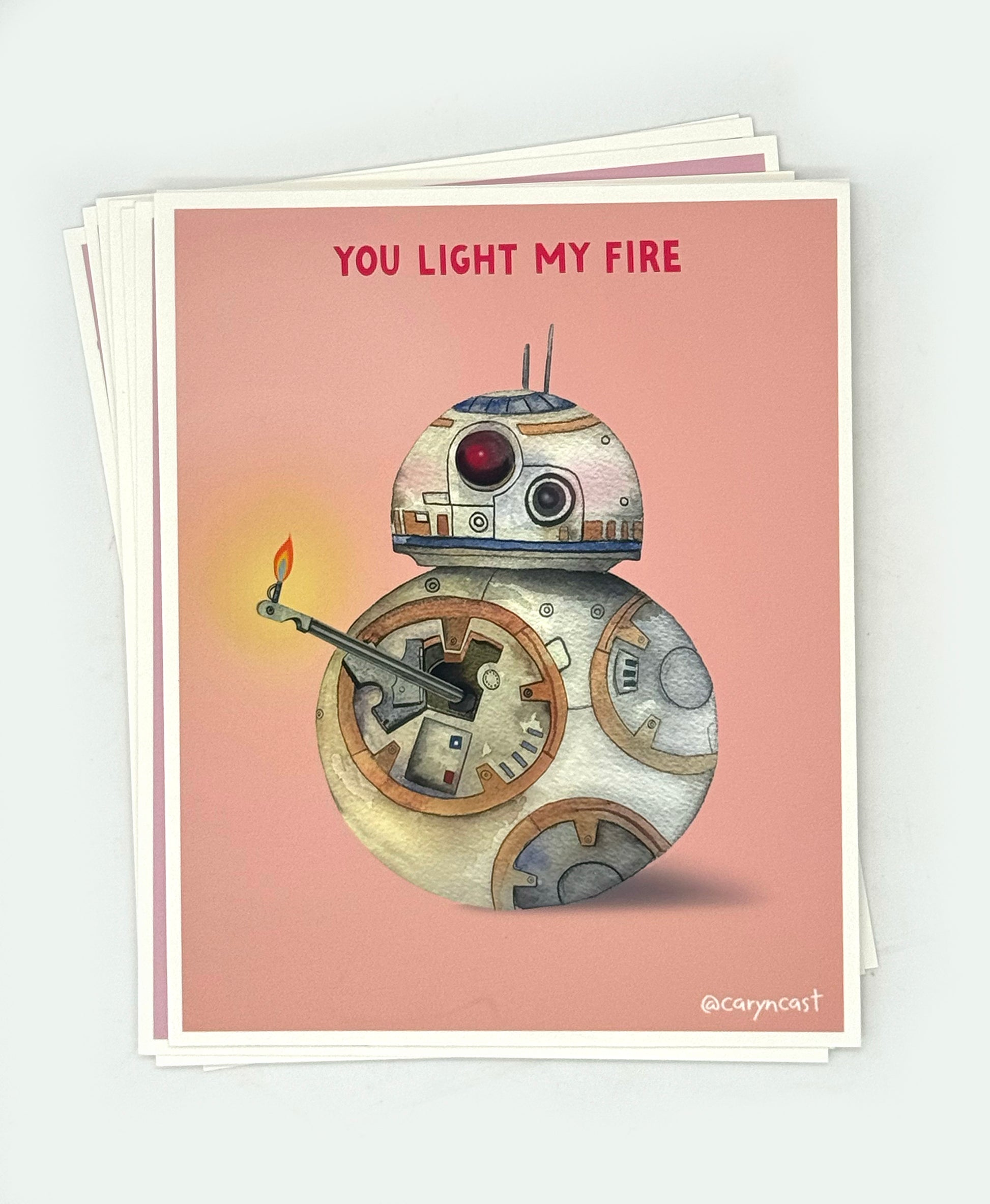 Set of 4 Star Wars romance postcards to send to your favorite Star Wars crush. Featuring Salacious B. Crumb, Baby Yoda, Jabba the Hutt, and BB8. Postcards are doublesided with a small inscription and address on the back, ready to mail. Postcard set comes in a biodegradable protective sleeve. Available as a set of 4 (one of each design) or set of 12 (three of each design).