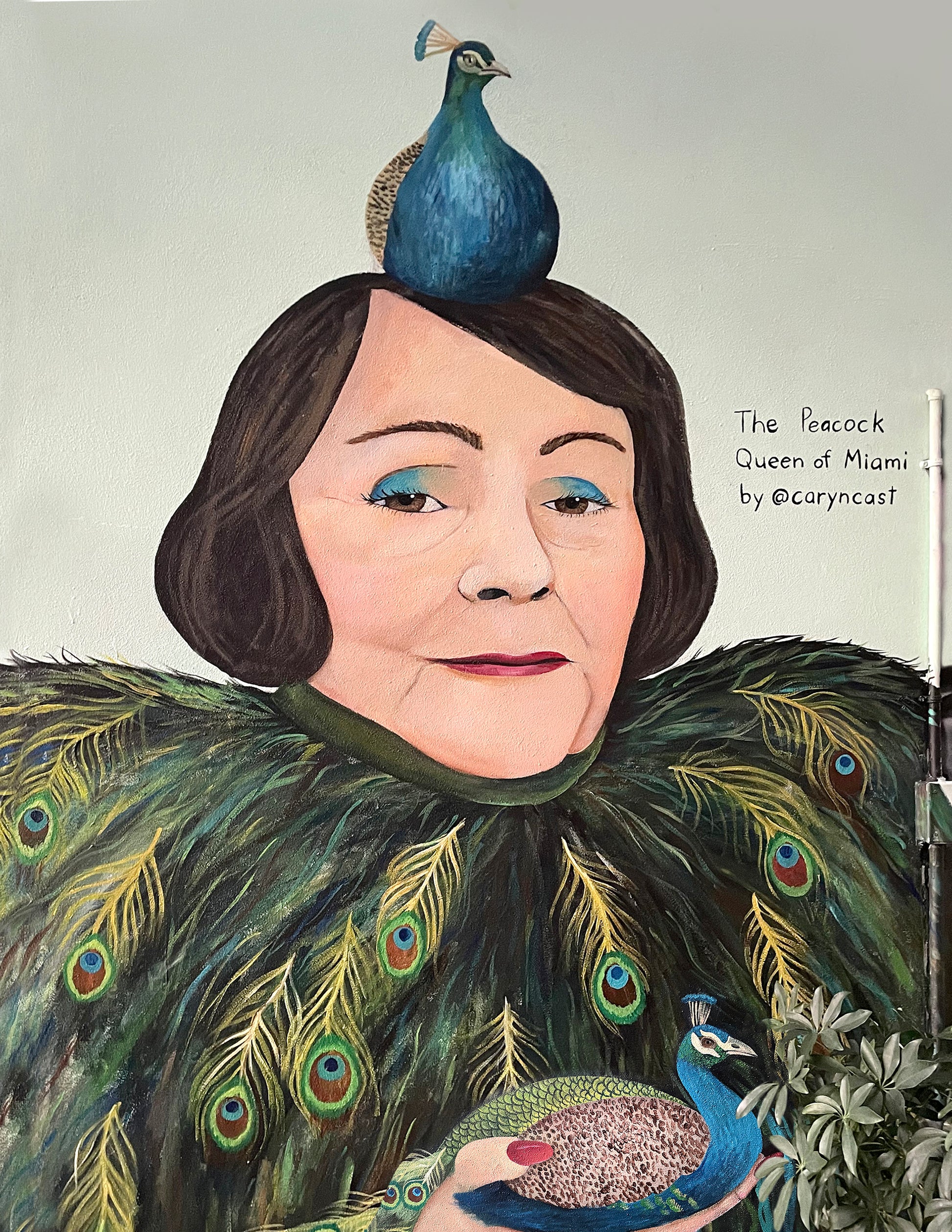 This is a print of an original mural created in Wynwood, Miami. The Peacock Queen hangs out on a busy street in Miami with all her wild peacocks. The high res print of the mural is printed on heavy archival Epson hot press paper. This cotton rag paper has a smooth matte finish, pairing with the rich color palette of this peacock scene. Print comes with a small border around, ready to frame.