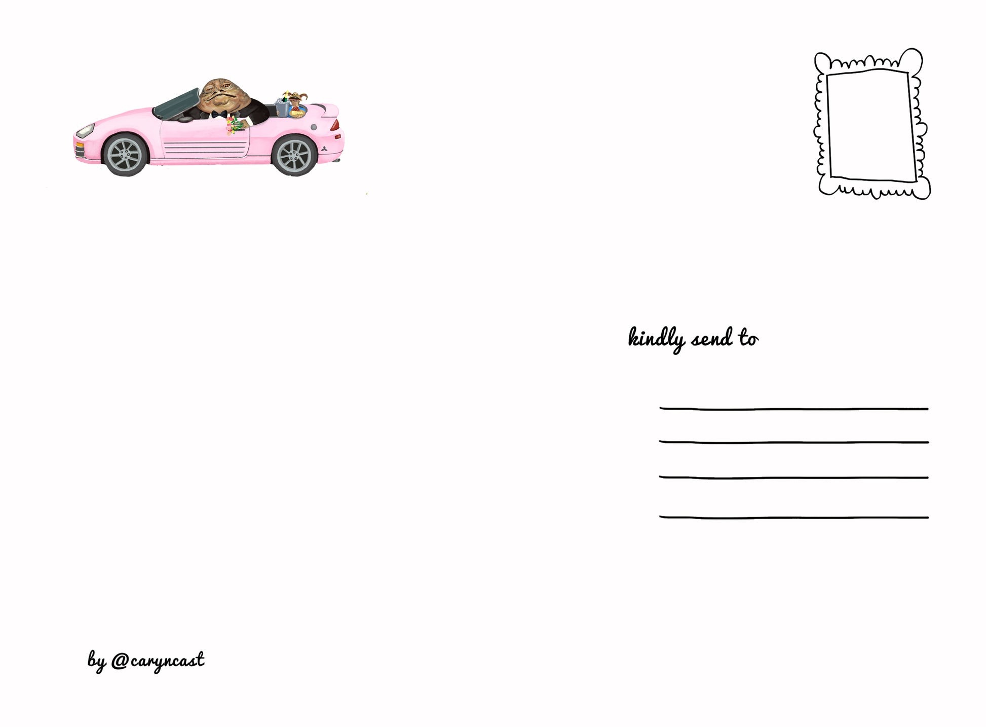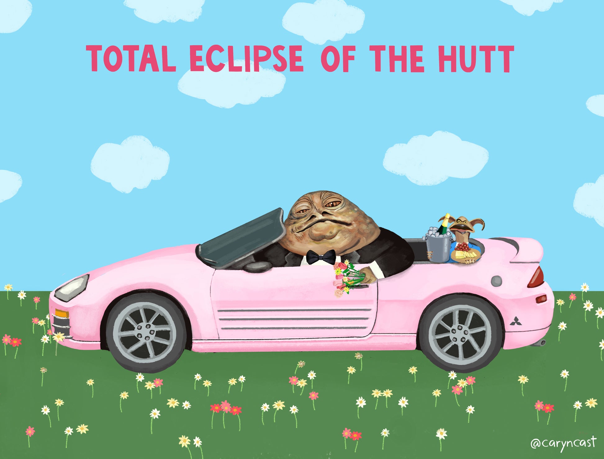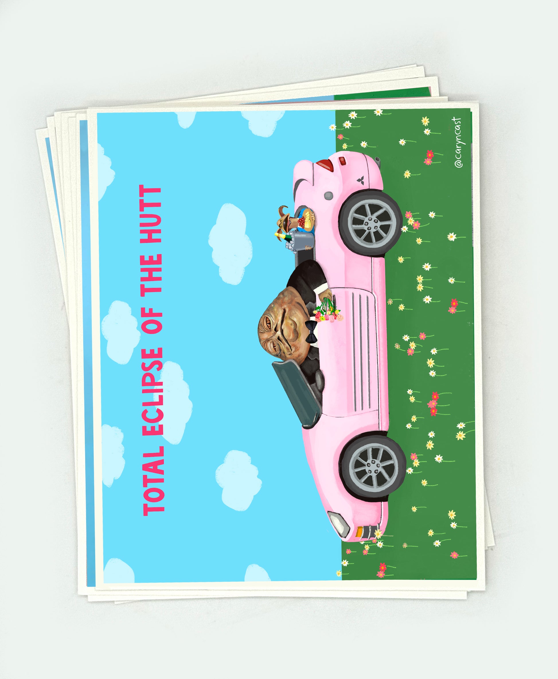 Jabba the Hutt in his shiny new Mitsubishi Eclipse with all the romantic feels. Now available as a doublesided postcard to send some cheery snail mail. Zoom in on the backseat where you will find Salacious B. Crumb and a fancy bottle of champagne. Total Eclipse of the Hutt is printed on acid-free Epson hot press paper and won’t fade one bit. Also available in a Star Wars postcard set.
