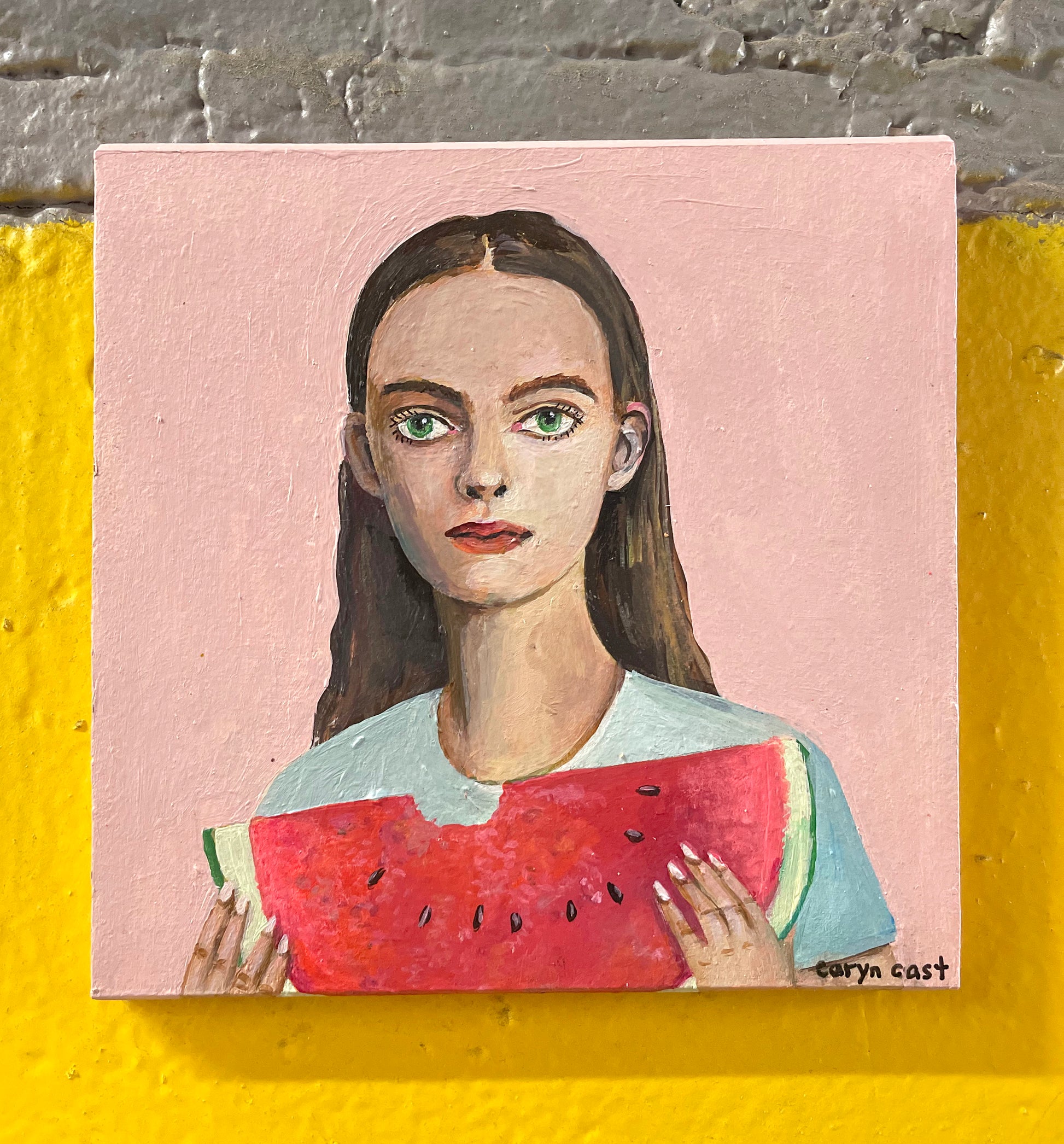 Watermelon Girl, handpainted in acrylics on an old ceramic tile and custom made to order. This mini painting extends across the 1/2” side panel. Measures 8” X 8” with a hook on the back, ready to hang!