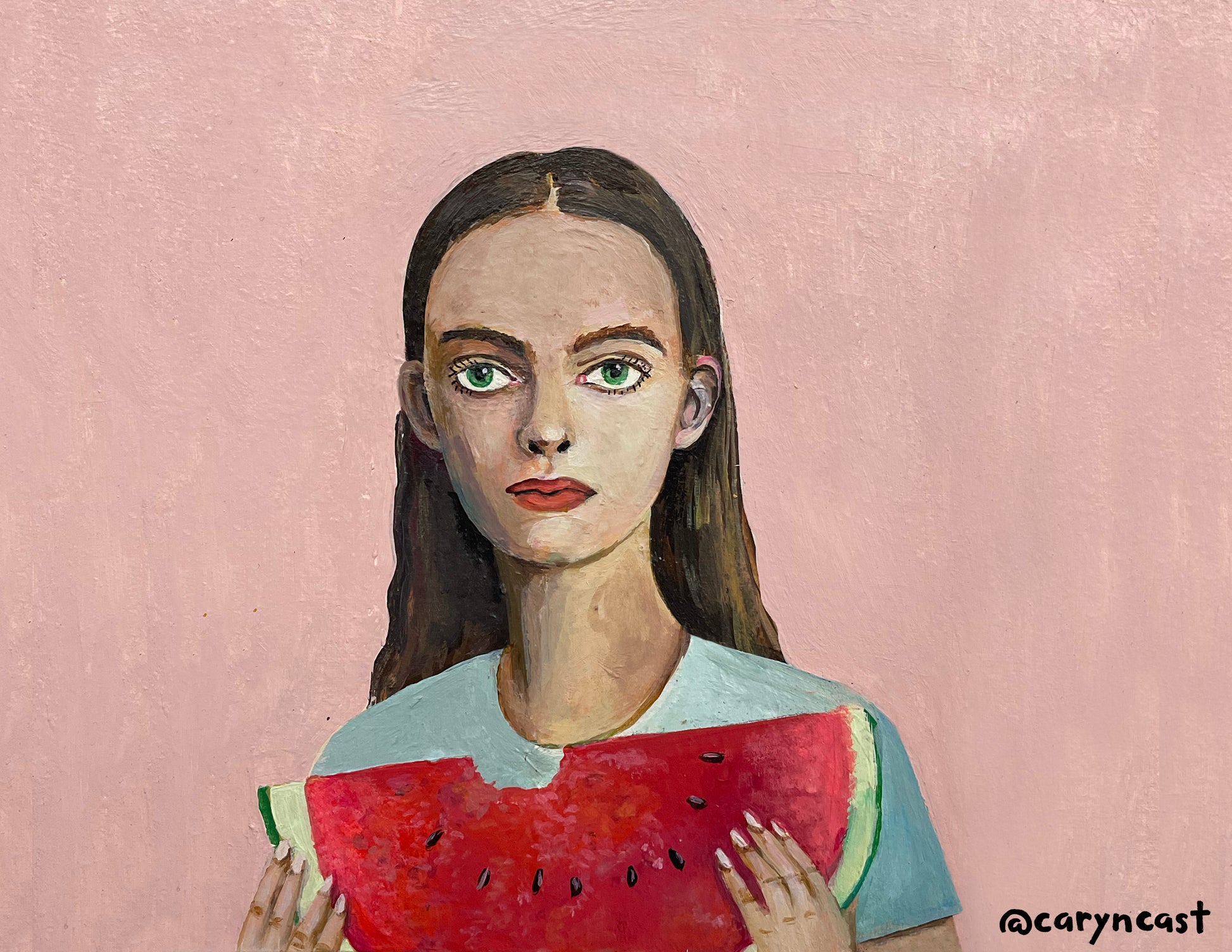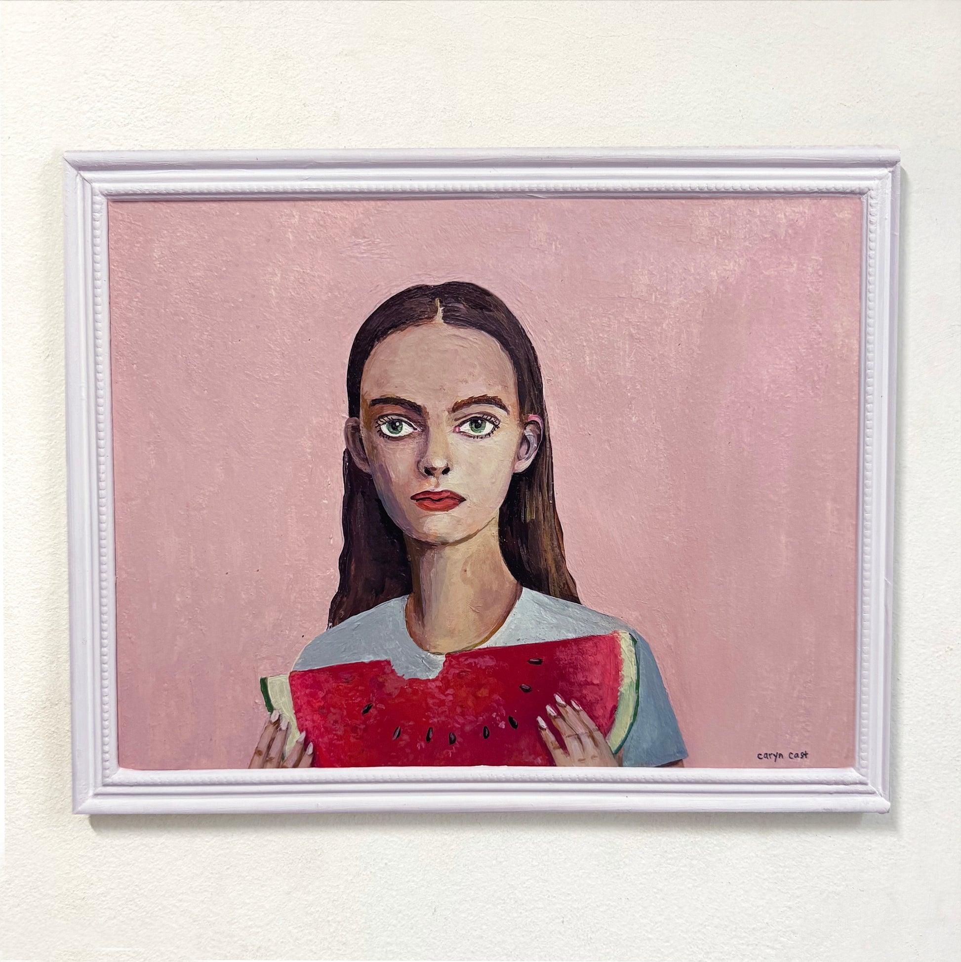 This is a print of the original painting created in acrylics on an old clay tile of watermelon girl. The print is created on heavy archival Epson hot press paper with a smooth matte finish, pairing with the bright color palette of the girl and her watermelon. Print comes with a small border around, ready to frame.
